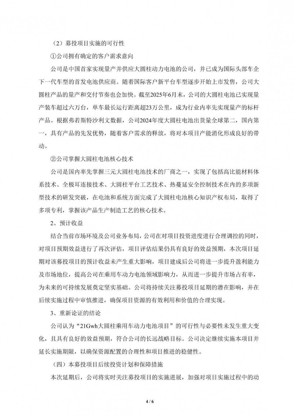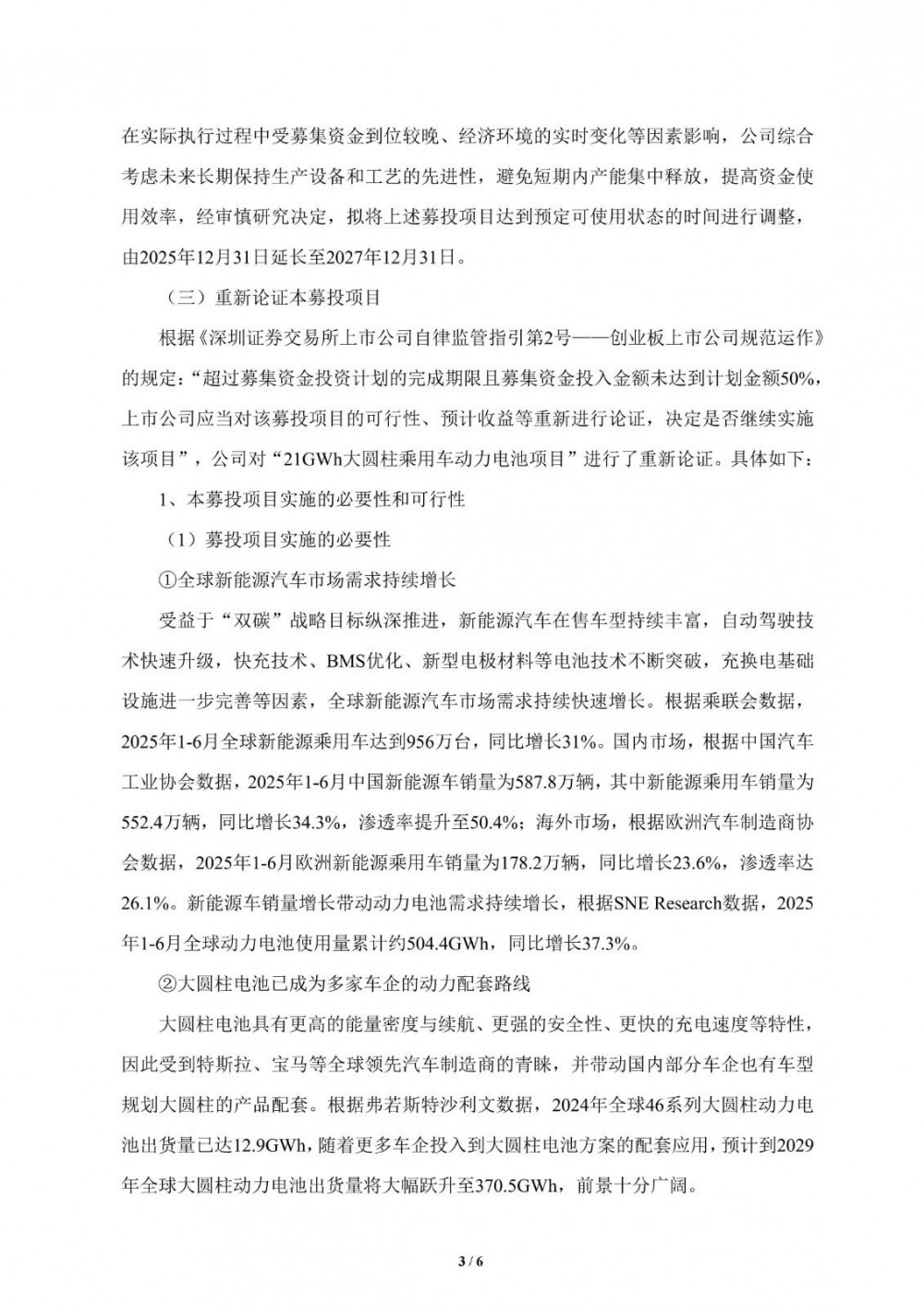 “21Gwh大圆柱乘用车动力电池项目”主要定位于三元圆柱大电池产品的产能建设,产品用于新能源汽车的动力配套。为确保募集资金使用的合理性与安全性,亿纬锂能坚持“审慎推进、精准投入”的原则。募投项目已在前期经过充分的可行性论证,但在实际执行过程中受募集资金到位较晚、经济环境的实时变化等因素影响,公司综合考虑未来长期保持生产设备和工艺的先进性,避免短期内产能集中释放,提高资金使用效率,经审慎研究决定,拟将上述募投项目达到预定可使用状态的时间进行调整,由2025年12月31日延长至2027年12月31日。