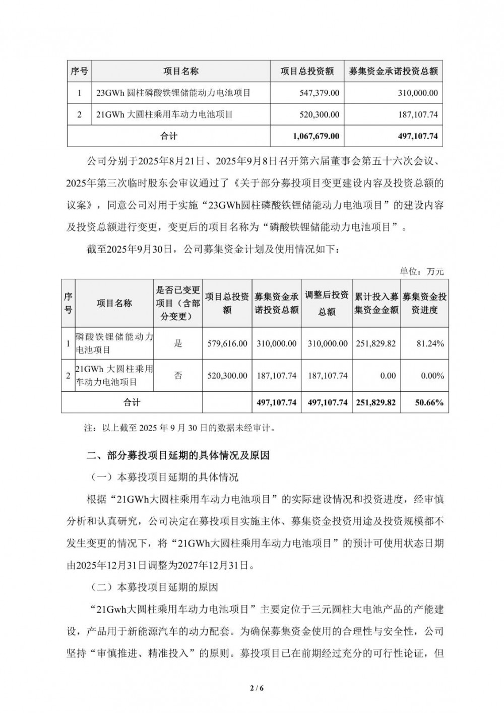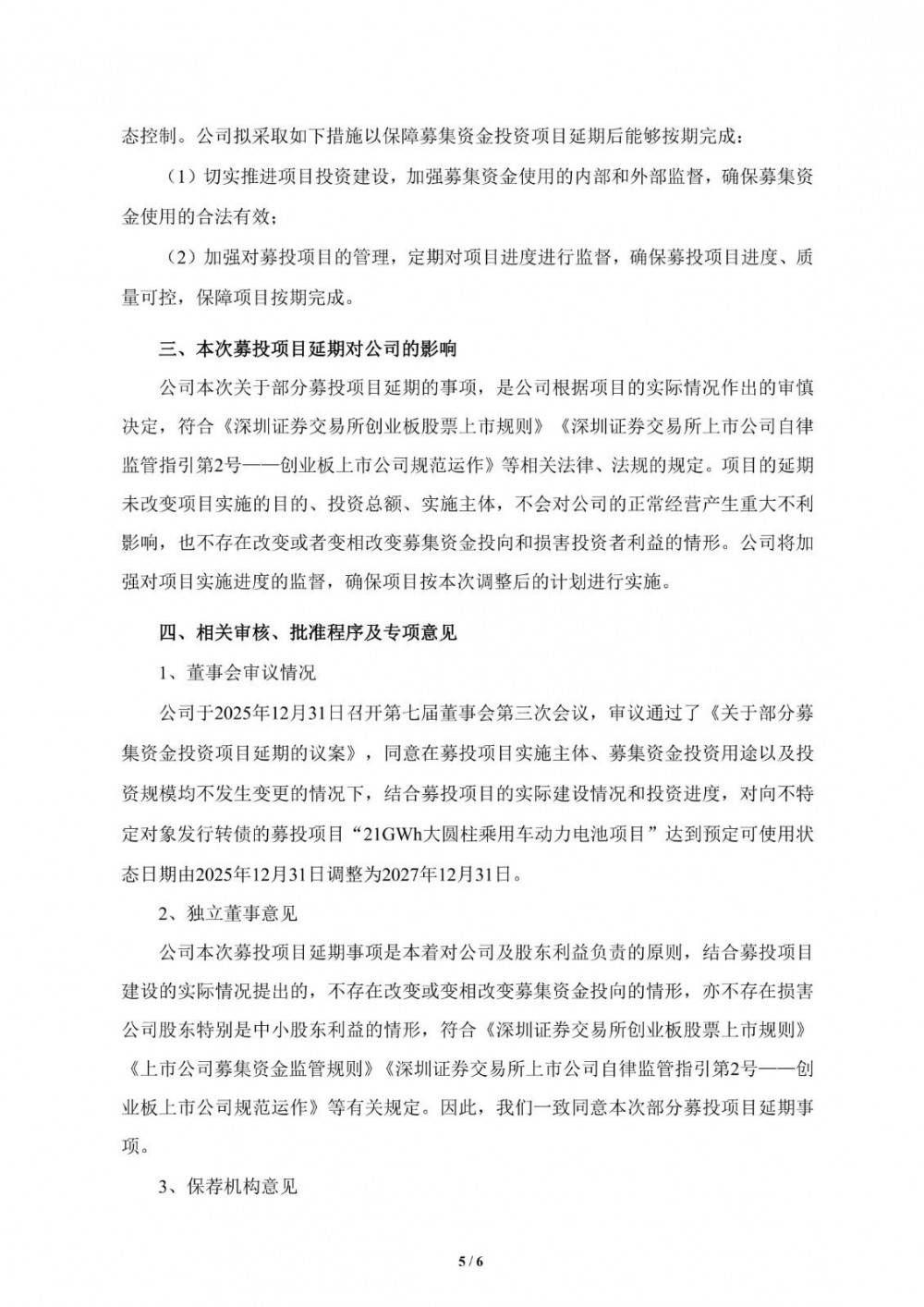 12月31日,亿纬锂能发布公告称,公司召开第七届董事会第三次会议,审议通过了《关于部分募集资金投资项目延期的议案》。在募集资金投资项目实施主体、募集资金投资用途以及投资规模均不发生变更的情况下,结合募集资金投资项目的实际建设情况和投资进度,公司决定对向不特定对象发行转债的募投项目“21GWh大圆柱乘用车动力电池项目”达到预定可使用状态日期由2025年12月31日调整为2027年12月31日。