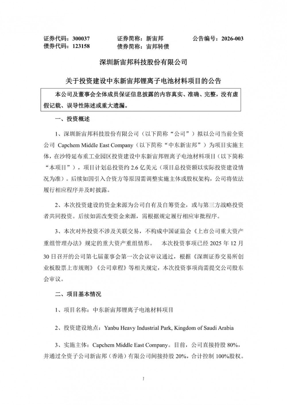 12月31日,新宙邦发布公告称,公司拟以公司当前全资公司Capchem Middle East Company为项目实施主体,在沙特延布重工业园区投资建设中东新宙邦锂离子电池材料项目,项目计划总投资约2.6亿美元。