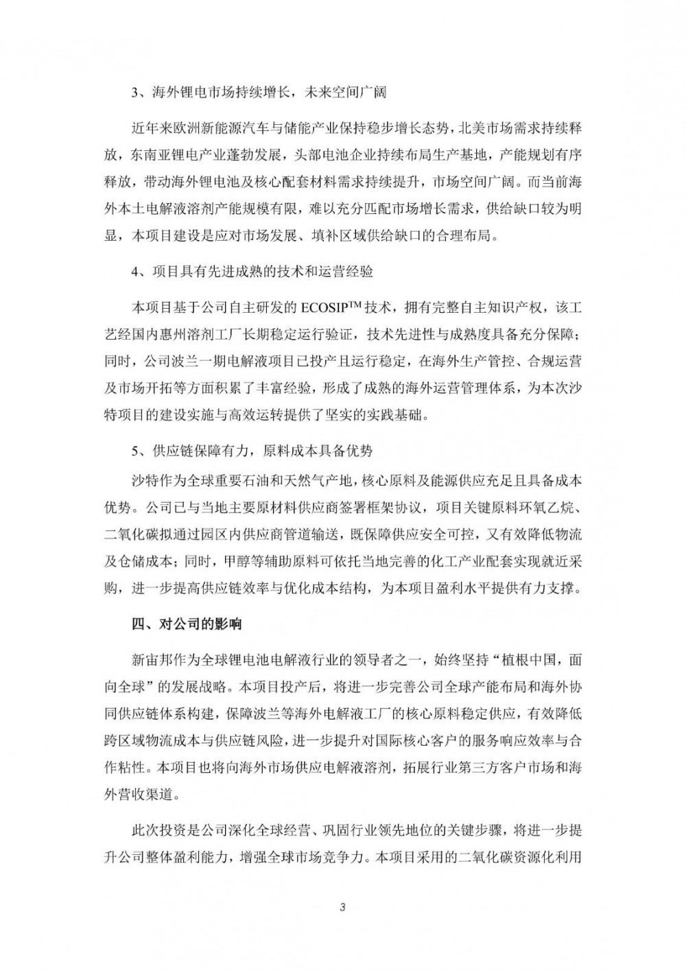 新宙邦表示,此次投资是公司深化全球经营、巩固行业领先地位的关键步骤,将进一步提升公司整体盈利能力,增强全球市场竞争力。本项目采用的二氧化碳资源化利用工艺,符合全球“双碳”战略及沙特低碳发展相关政策要求,为公司长期高质量可持续发展奠定坚实基础。本次投资符合公司与全体股东的根本利益。