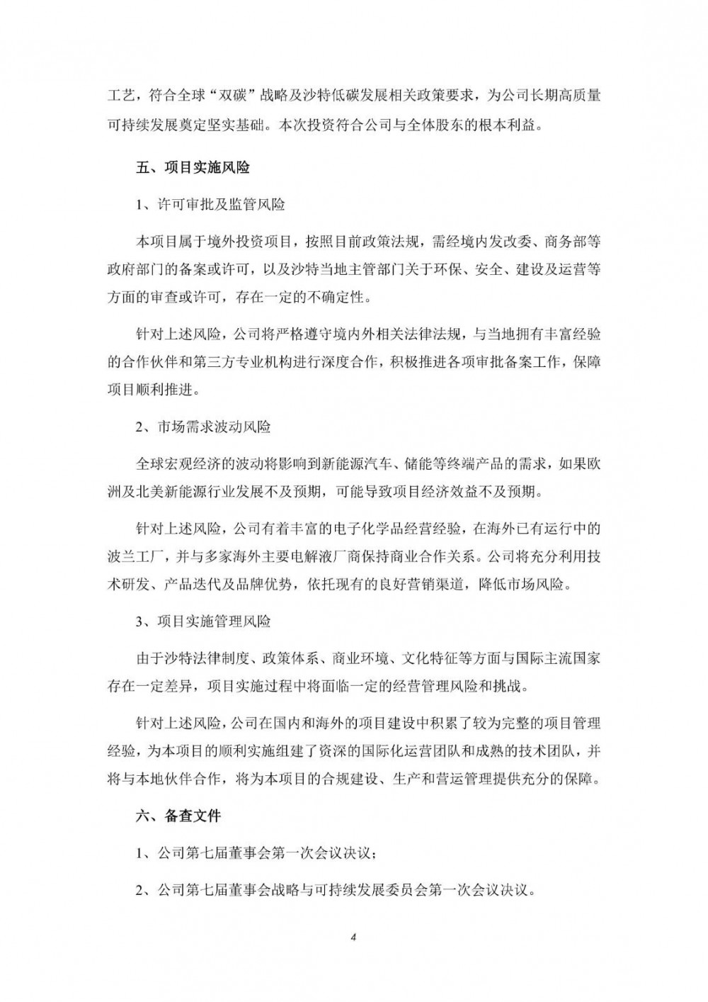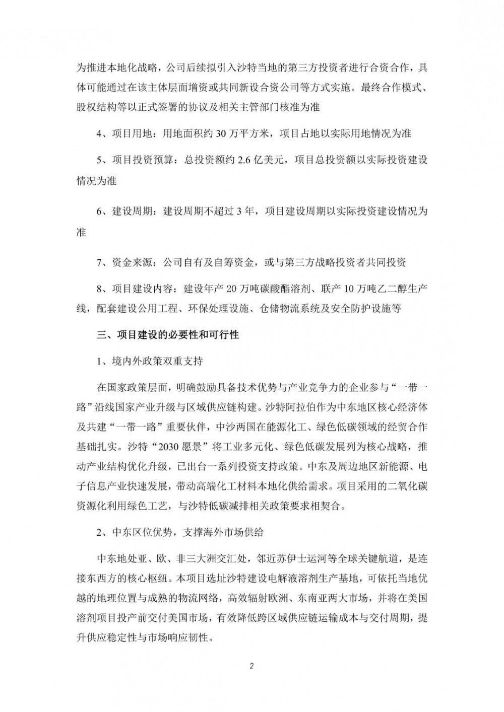 本项目基于公司自主研发的ECOSIPTM技术,拥有完整自主知识产权,该工艺经国内惠州溶剂工厂长期稳定运行验证,技术先进性与成熟度具备充分保障;同时,公司波兰一期电解液项目已投产且运行稳定,在海外生产管控、合规运营及市场开拓等方面积累了丰富经验,形成了成熟的海外运营管理体系,为本次沙特项目的建设实施与高效运转提供了坚实的实践基础。