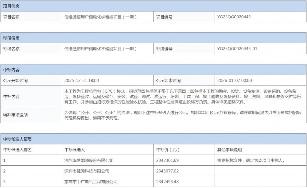 第一中标候选人为深圳库博能源股份有限公司,投标报价2342301.69元,折合单价0.9719元/Wh;第二中标候选人为深圳市健网科技有限公司,投标报价2343077.02元,折合单价0.9722元/Wh;第三中标候选人为东莞市中广电气工程有限公司,投标报价2342493.48元,折合单价0.972元/Wh。