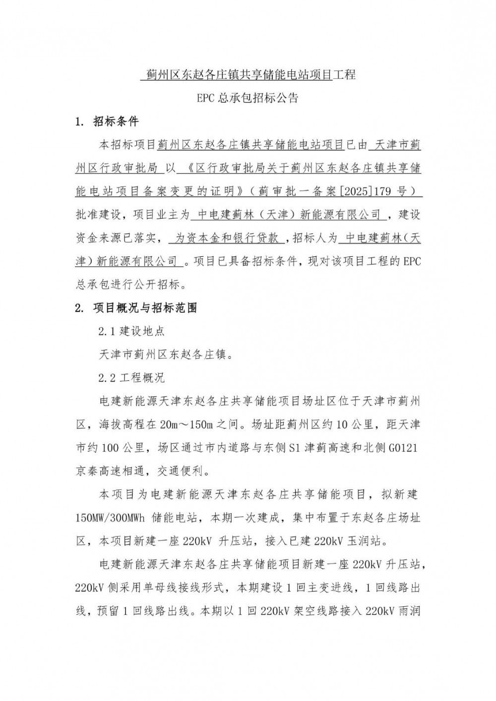 12月31日,蓟州区东赵各庄镇共享储能电站项目工程EPC总承包公开招标公告发布。