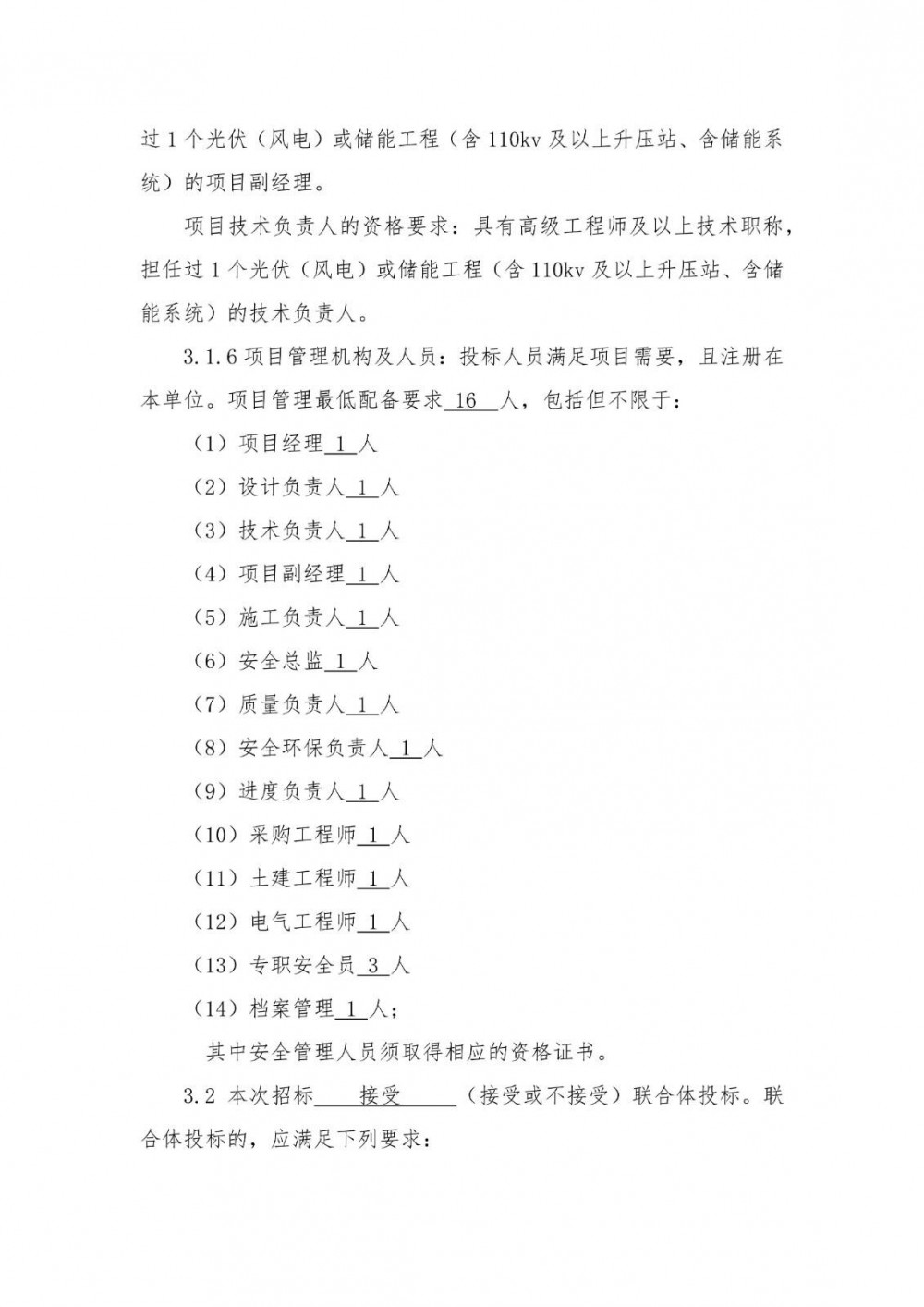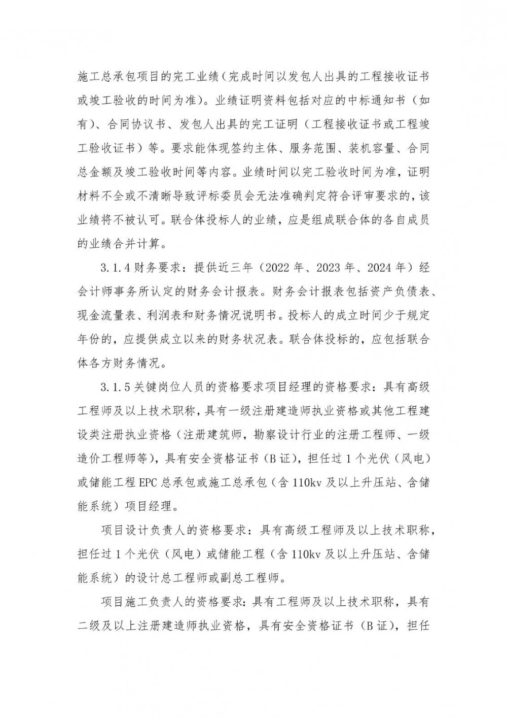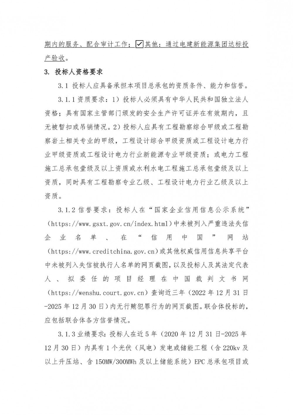 投标人在近5年(2020年12月31日-2025年12月30日)内具有1个光伏(风电)发电或储能工程(含220kv及以上升压站、含150MW/300MWh及以上储能系统)EPC总承包项目或施工总承包项目的完工业绩(完成时间以发包人出具的工程接收证书或竣工验收的时间为准)。