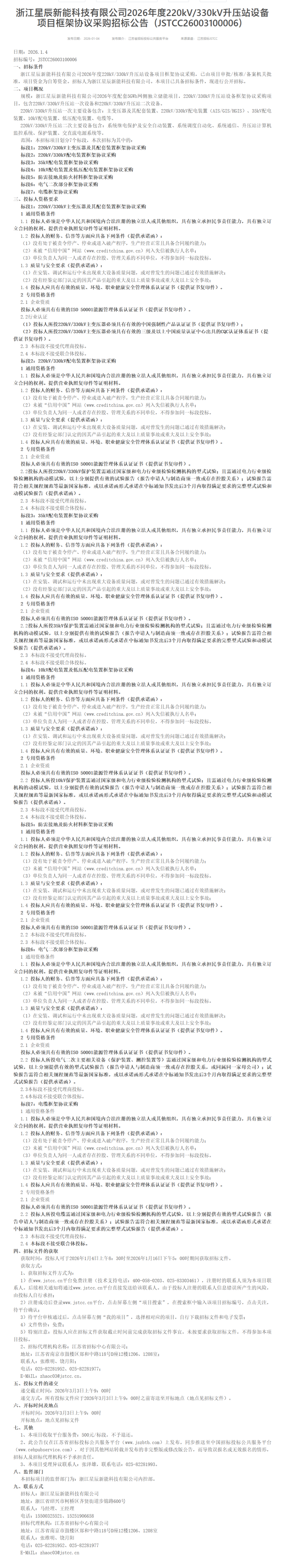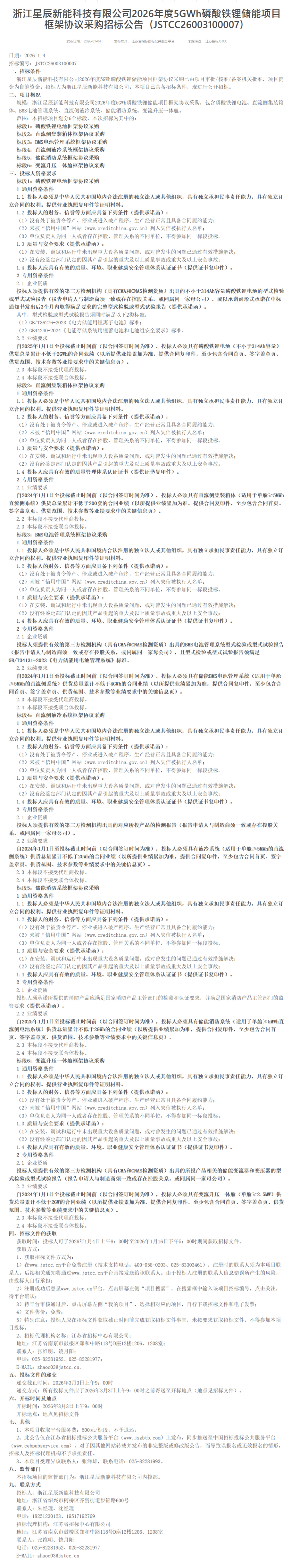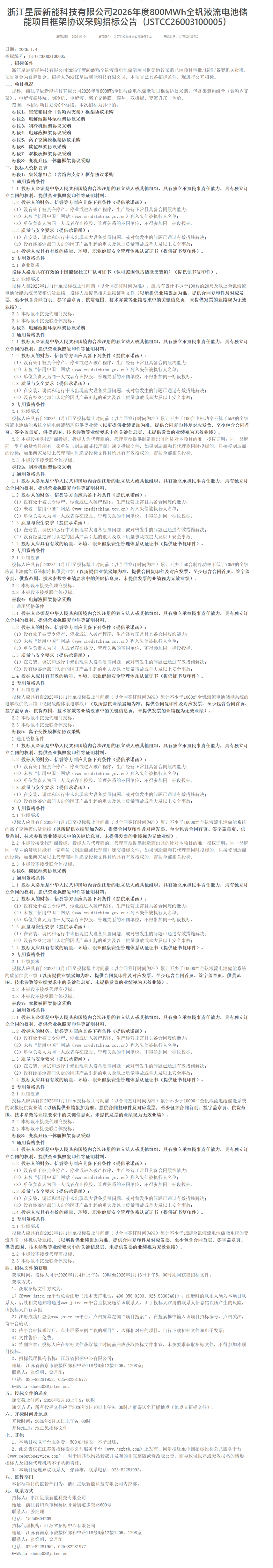 1月4日,浙江星辰新能科技有限公司发布5GWh磷酸铁锂储能项目框架协议采购、800MWh全钒液流电池储能项目框架协议采购、220kV/330kV升压站设备框架协议采购招标公告。