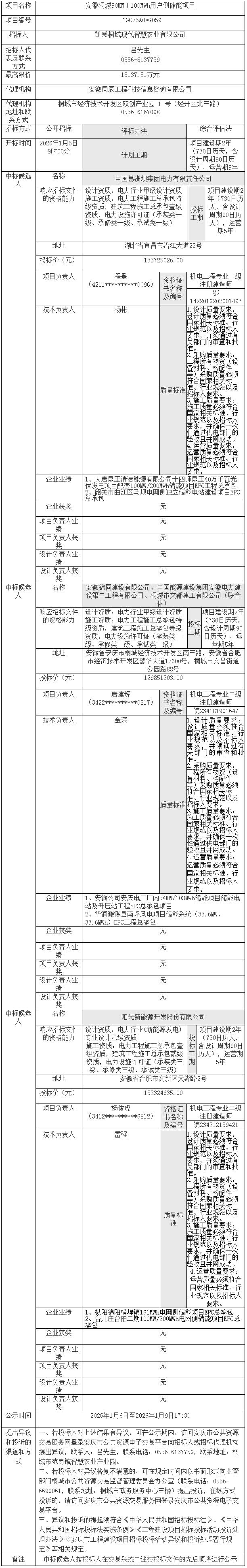第一中标候选人为中国葛洲坝集团电力有限责任公司,投标报价133725026元,折合单价1.3373元/Wh;第二中标候选人为安徽锦同建设有限公司、中国能源建设集团安徽电力建设第二工程有限公司、桐城市文都建工有限公司联合体,投标报价129851203元,折合单价1.2985元/Wh;第三中标候选人为阳光新能源开发股份有限公司,投标报价132324635元,折合单价1.3232元/Wh。