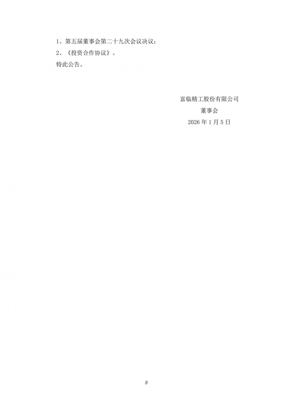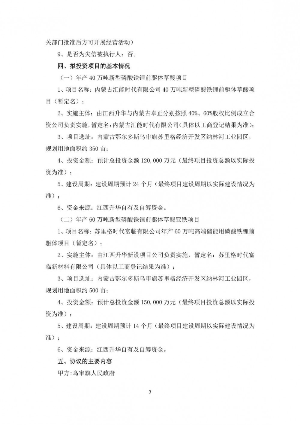 1月5日,富临精工发布公告称,鉴于公司子公司江西升华新材料有限公司(以下简称“江西升华”)拟在内蒙古自治区鄂尔多斯市伊金霍洛旗蒙苏经济开发区投资建设年产50万吨高端储能用磷酸铁锂项目,为保障年产50万吨高端储能用磷酸铁锂项目核心配套原料供应,江西升华拟与内蒙古自治区鄂尔多斯市乌审旗人民政府、内蒙古卓正煤化工有限公司(以下简称“内蒙古卓正”)签署《投资合作协议》,江西升华拟在乌审旗新建“年产40万吨新型磷酸铁锂前驱体草酸项目”及“年产60万吨新型磷酸铁锂前驱体草酸亚铁项目”。
