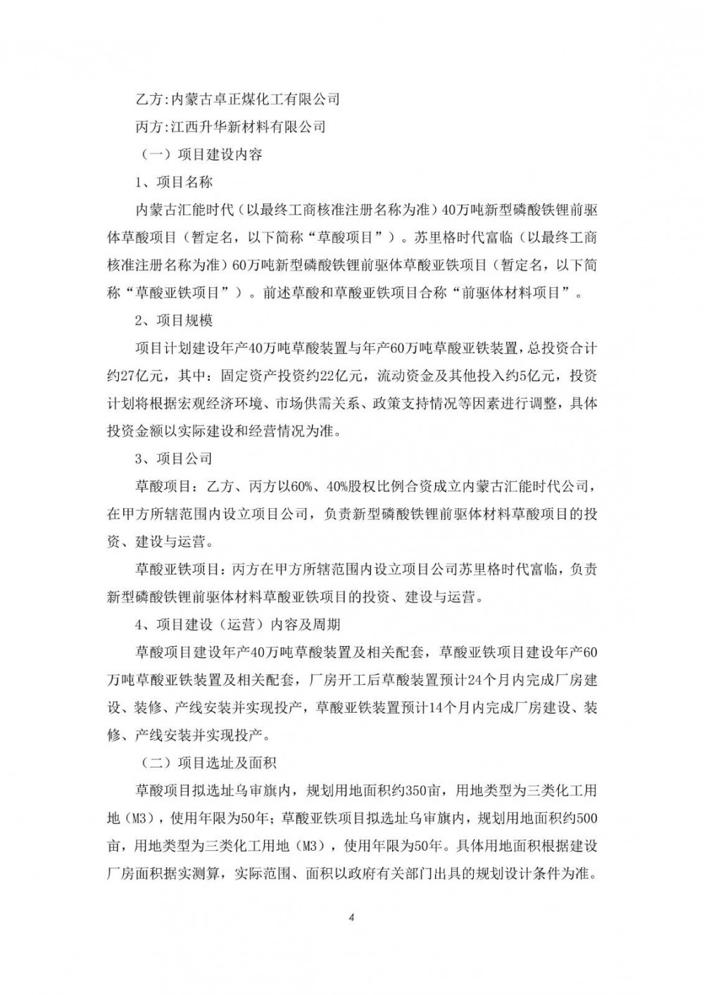 项目计划建设年产40万吨草酸装置与年产60万吨草酸亚铁装置,总投资合计约27亿元,其中:固定资产投资约22亿元,流动资金及其他投入约5亿元,投资计划将根据宏观经济环境、市场供需关系、政策支持情况等因素进行调整,具体投资金额以实际建设和经营情况为准。