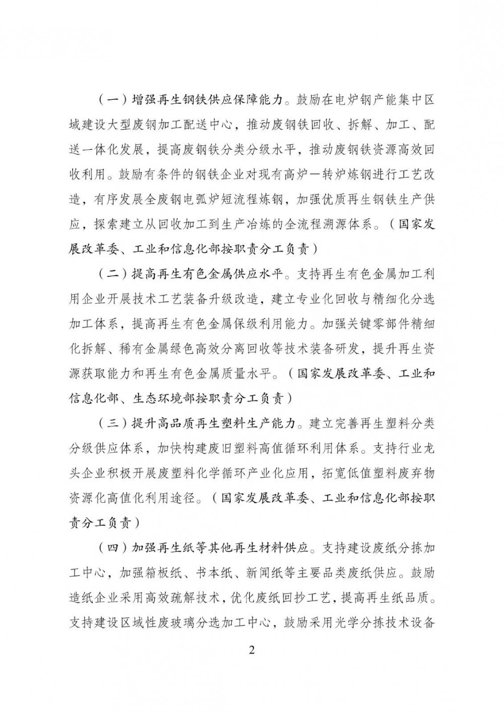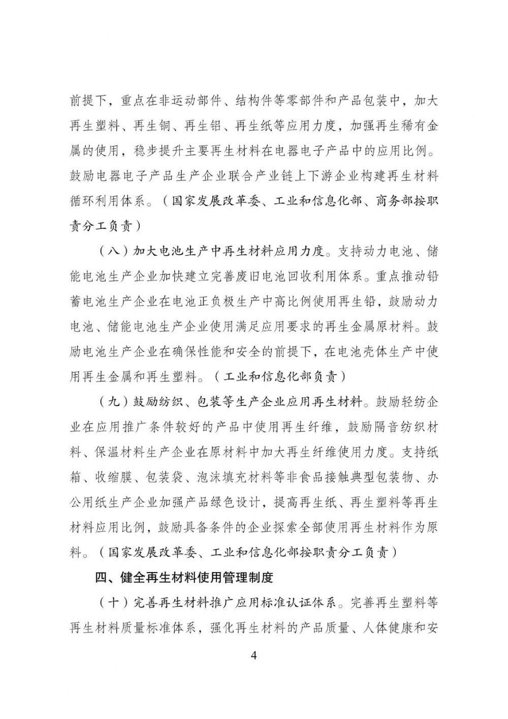 推进海外再生原料利用。完善再生有色金属、再生稀有金属等原料进口政策,研究完善退役动力电池等产品进口质量标准、性能指标体系等,规范进口再生纸浆监督监管。积极鼓励国内再生资源回收利用企业走出去,构建国际国内一体化的资源循环利用体系。