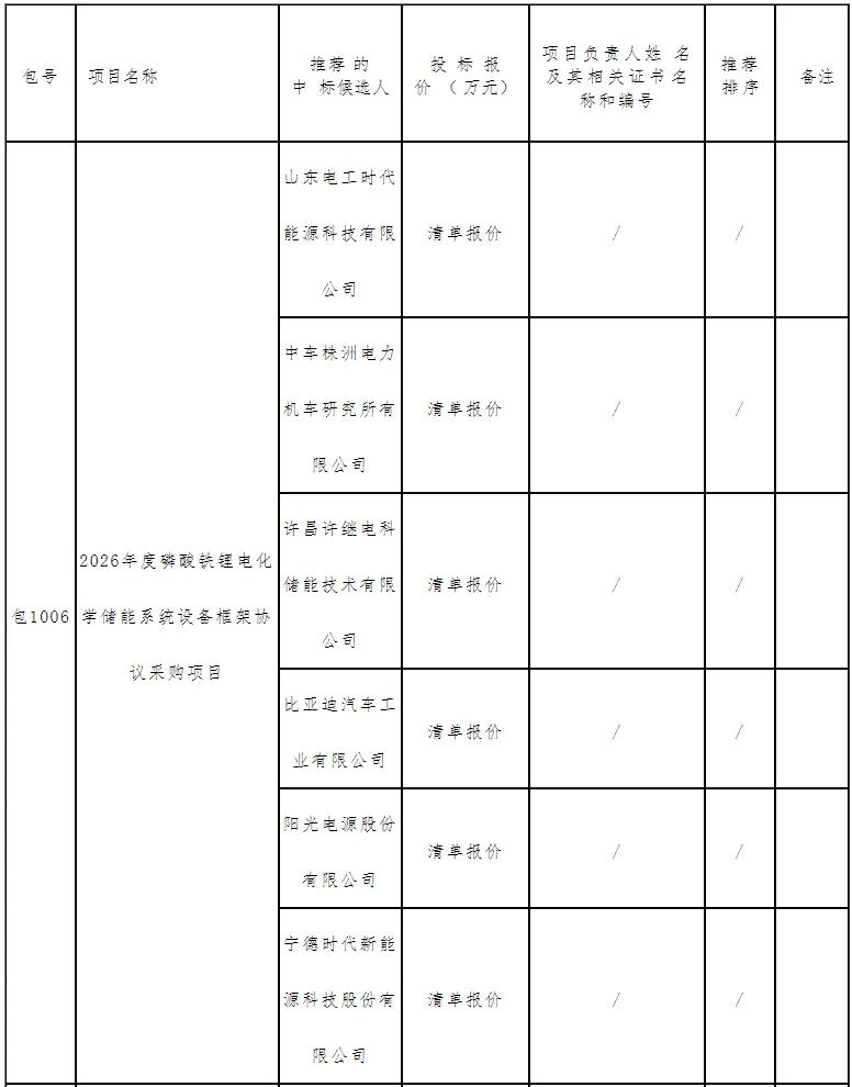 能源圈获悉,2026年1月6日,中国绿发投资集团公示了2026年度磷酸铁锂电化学储能系统集采的中标候选人。