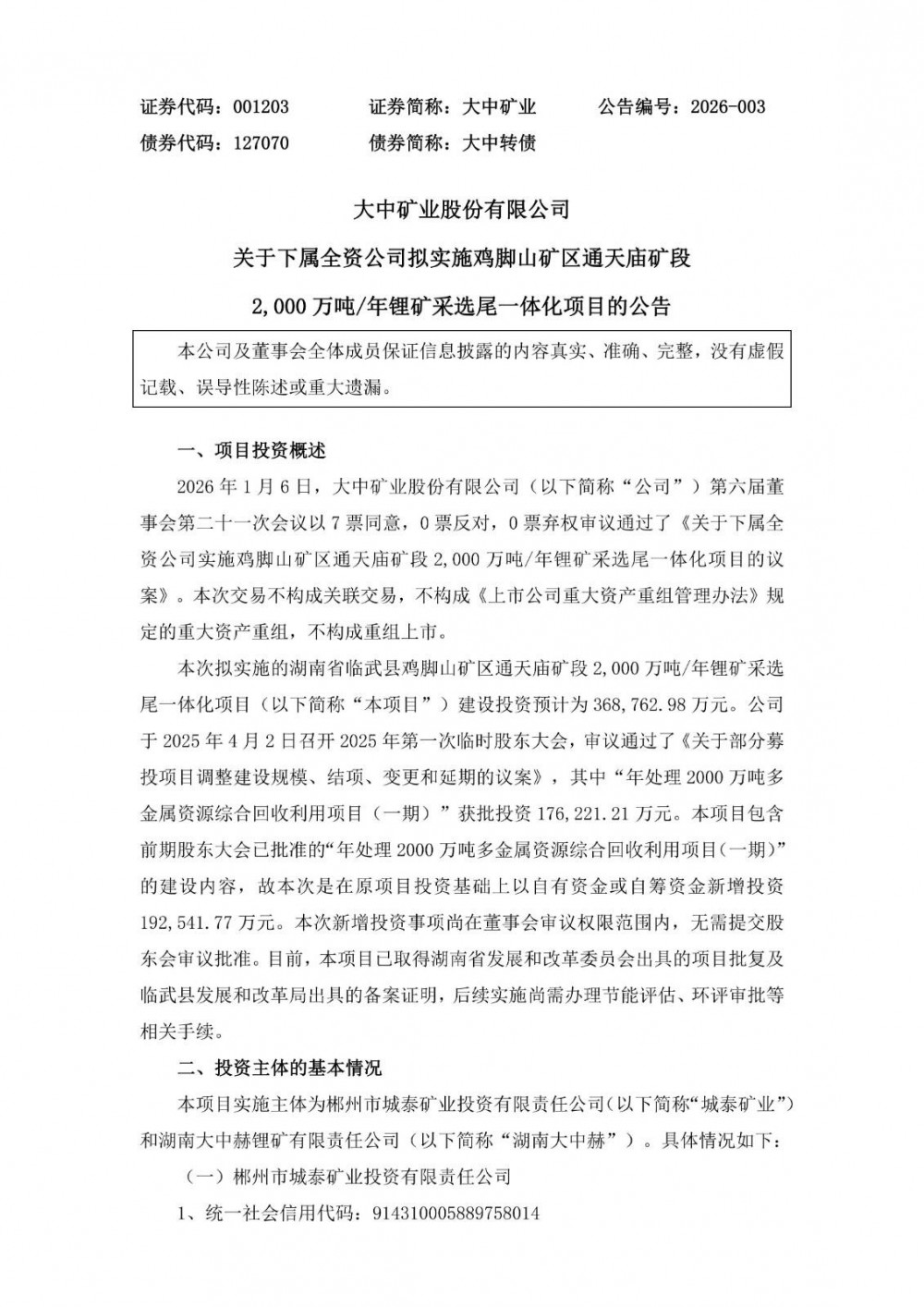 1月7日,大中矿业发布公告称,本次拟实施的湖南省临武县鸡脚山矿区通天庙矿段2,000万吨/年锂矿采选尾一体化项目(以下简称“本项目”)建设投资预计为368,762.98万元。