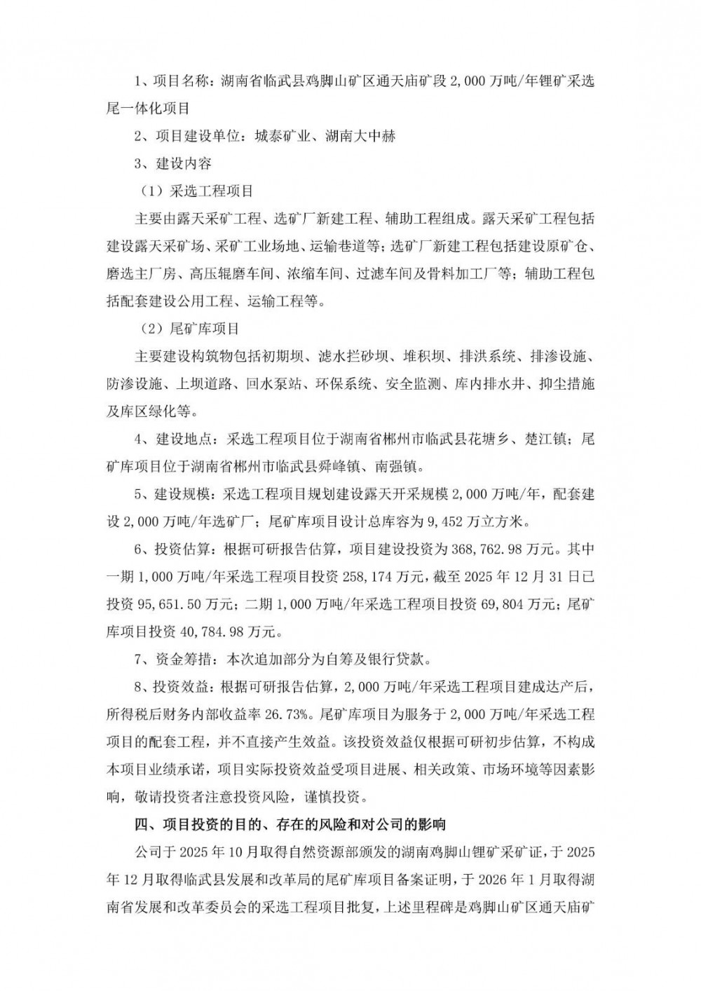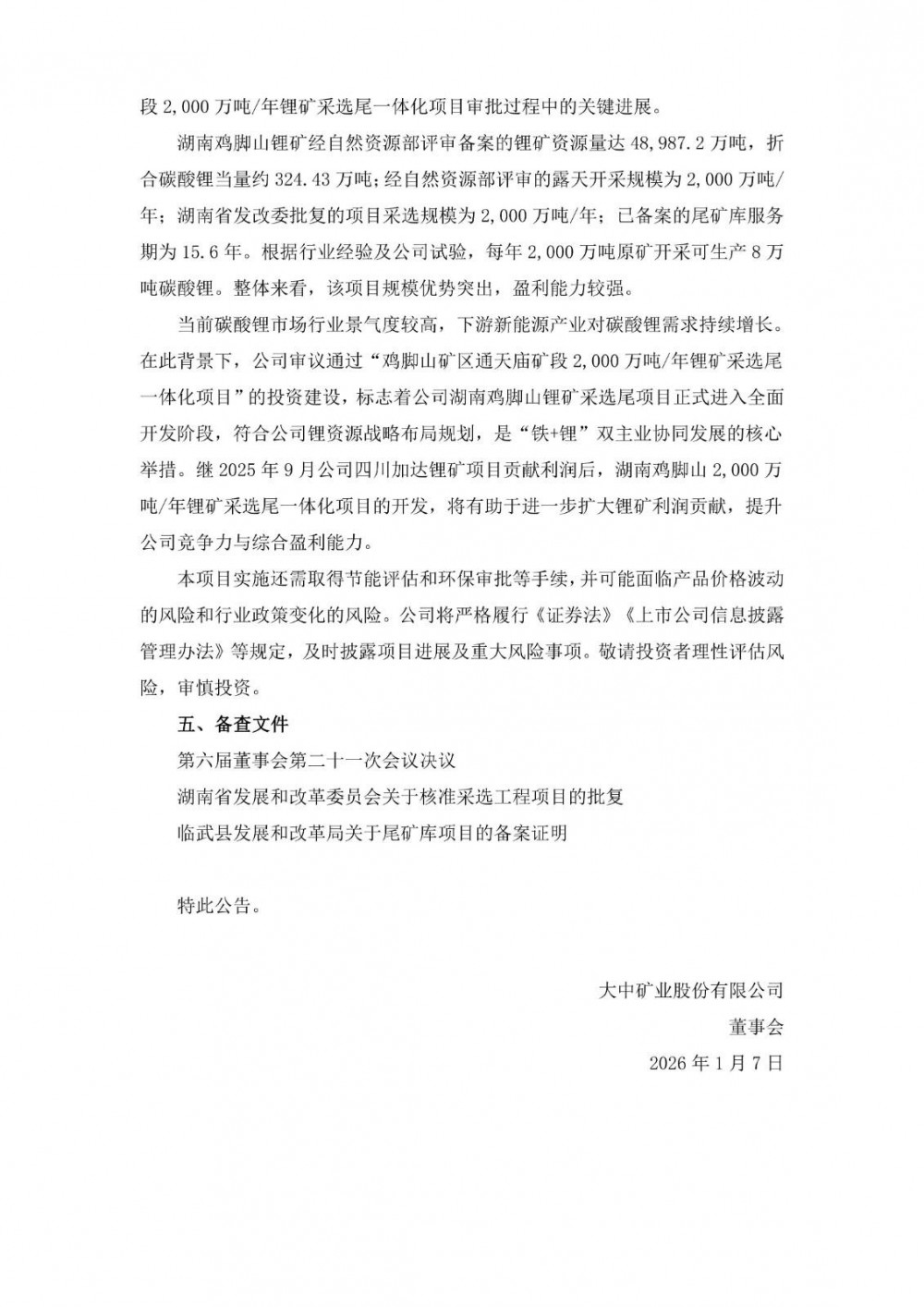 大中矿业表示,当前碳酸锂市场行业景气度较高,下游新能源产业对碳酸锂需求持续增长。在此背景下,公司审议通过“鸡脚山矿区通天庙矿段2,000万吨/年锂矿采选尾一体化项目”的投资建设,标志着公司湖南鸡脚山锂矿采选尾项目正式进入全面开发阶段,符合公司锂资源战略布局规划,是“铁+锂”双主业协同发展的核心举措。继2025年9月公司四川加达锂矿项目贡献利润后,湖南鸡脚山2,000万吨/年锂矿采选尾一体化项目的开发,将有助于进一步扩大锂矿利润贡献,提升公司竞争力与综合盈利能力。