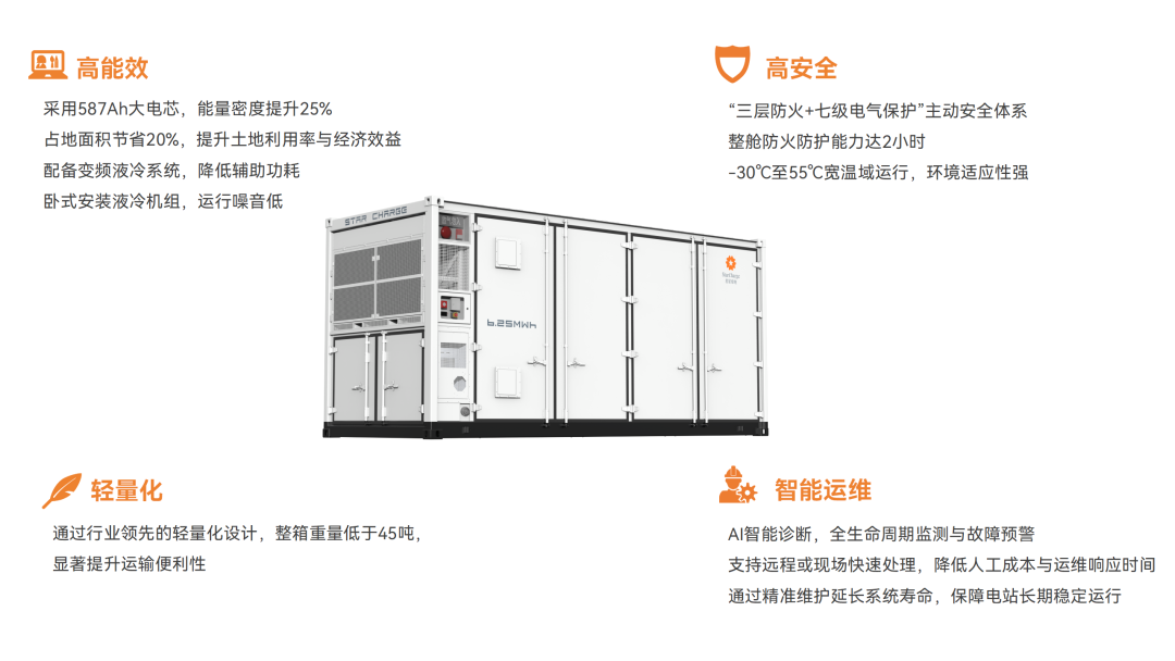 星星充电新一代6.25MWh储能系统,采用标准20尺集装箱设计,搭载587Ah大容量电芯,系统能量密度较上一代提升25%,系统占地面积较上一代节省20%,可有效提升土地资源利用率,为客户创造更高经济效益。
