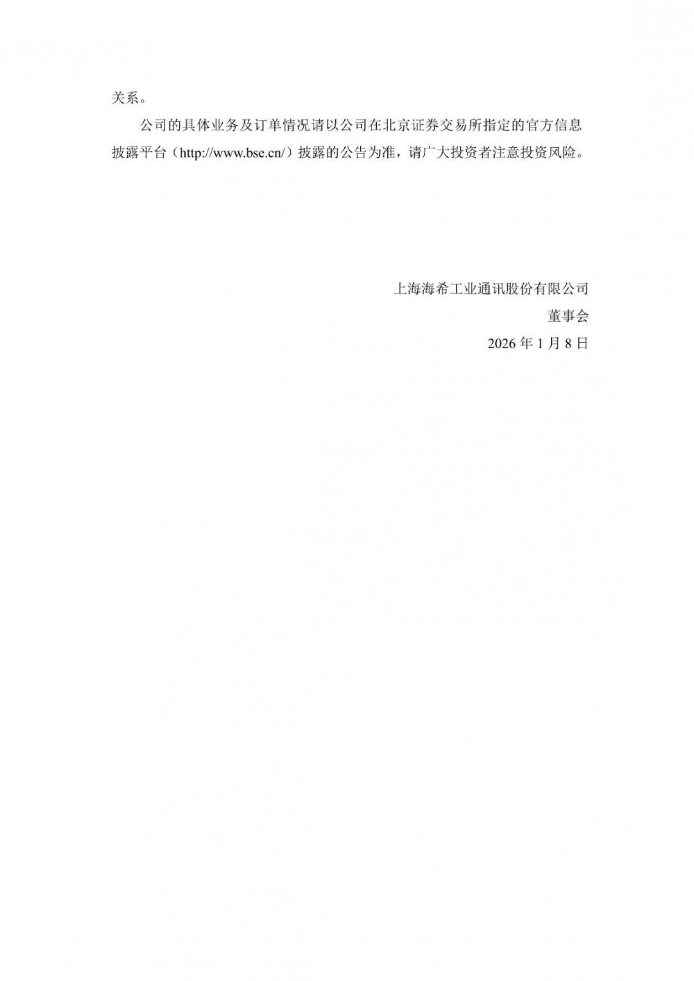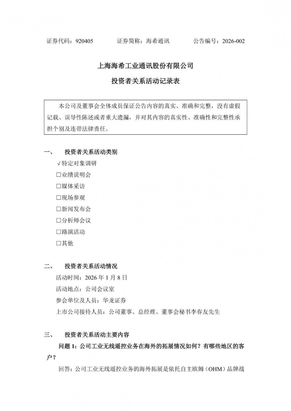2026年1月8日,上海海希工业通讯股份有限公司公告“投资者关系活动记录表”。