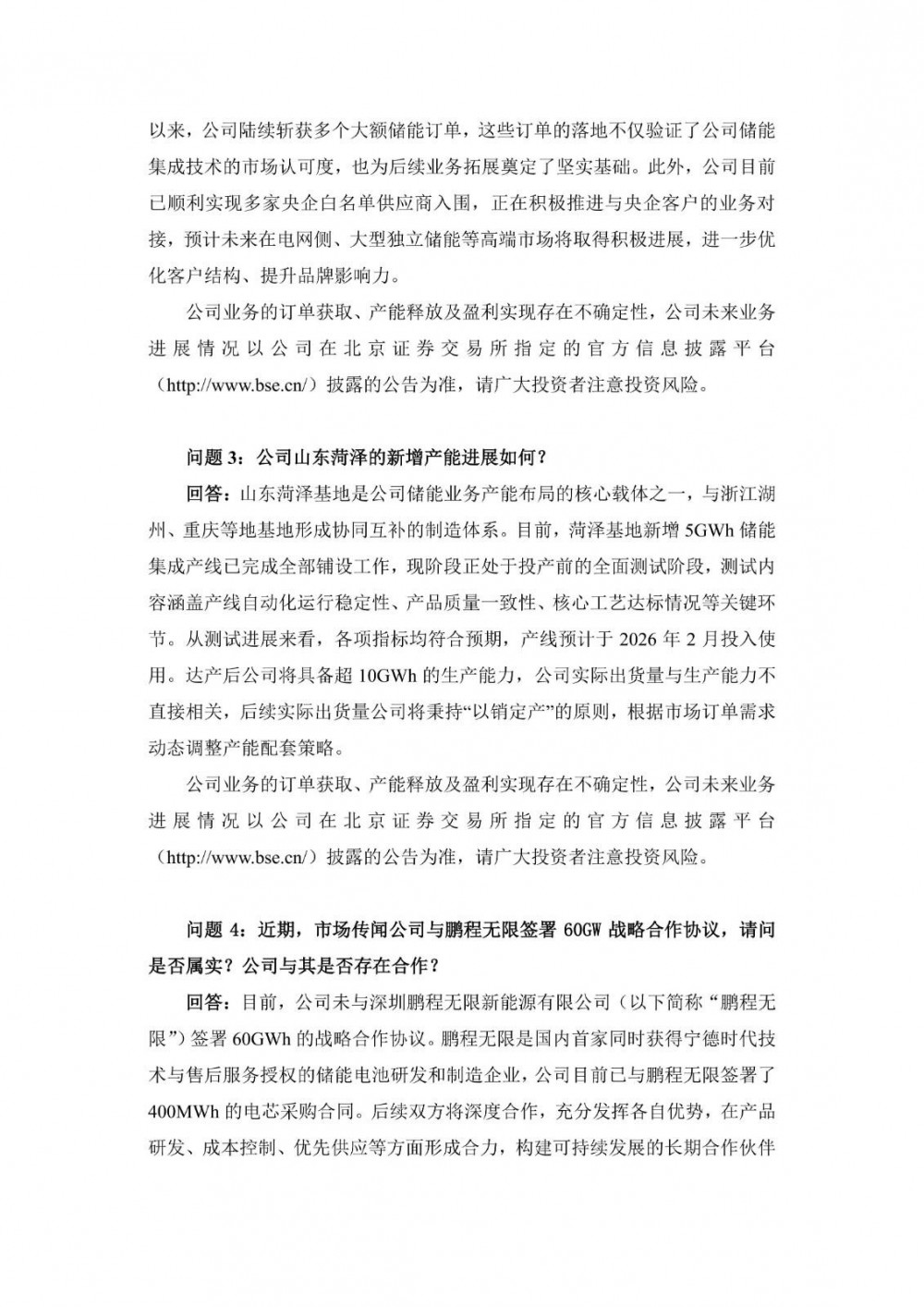 海希通讯表示,目前,公司未与深圳鹏程无限新能源有限公司(以下简称“鹏程无限”)签署60GWh的战略合作协议。