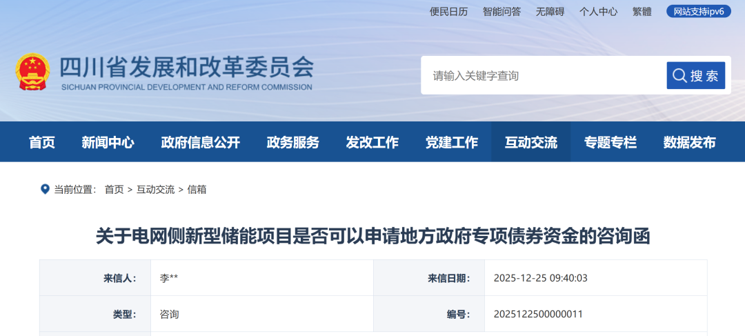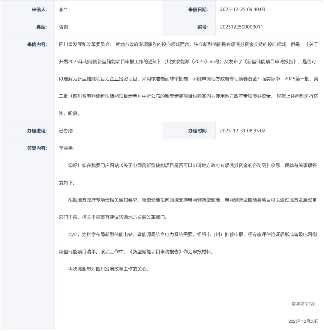 能源圈获悉,近日,有网友在四川省发改委网站上留言,咨询电网侧新型储能项目是否可以申请地方政府专项债券资金的问题,具体见下: