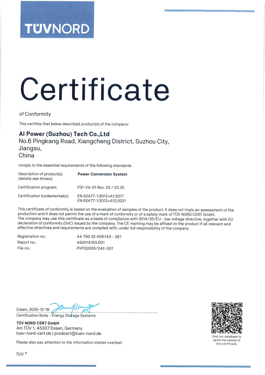 近期,苏州钧灏电力有限公司(以下简称“钧灏电力”)AIPS-100A构网型储能变流器荣膺TUV认证。这是继 AIPS-30/50A ,AIPS-630/1250A顺利通过认证后,钧灏电力构网型PCS产品再传捷报。这是一份基于IEC国际安全规范的权威性能鉴定报告。它标志着苏州钧灏系列构网型PCS产品在极限条件下,成功通过了从硬件到软件系统可靠性验证,在安全、效能与构网适应性三个维度均达到了国际一流水准,也标志着苏州钧灏组串式的PCS从30KW/50KW/100KW/125KW的DCAC交流和DCDC直流产品系列更进一步丰富了。