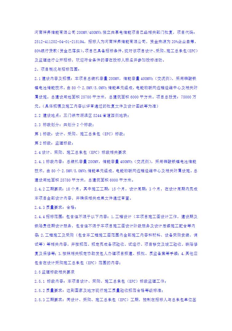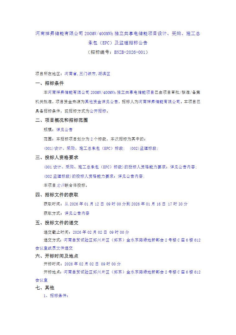 1月11日,河南祥昇储能有限公司200MW/400MWh独立共享电储能项目设计、采购、施工总承包(EPC)及监理招标公告发布。