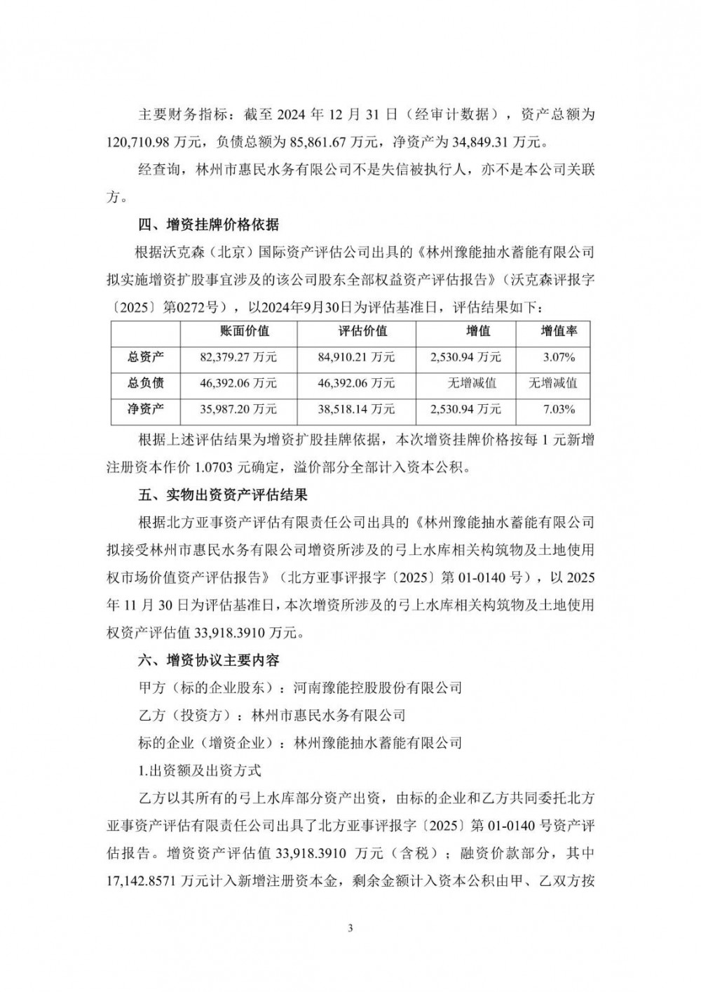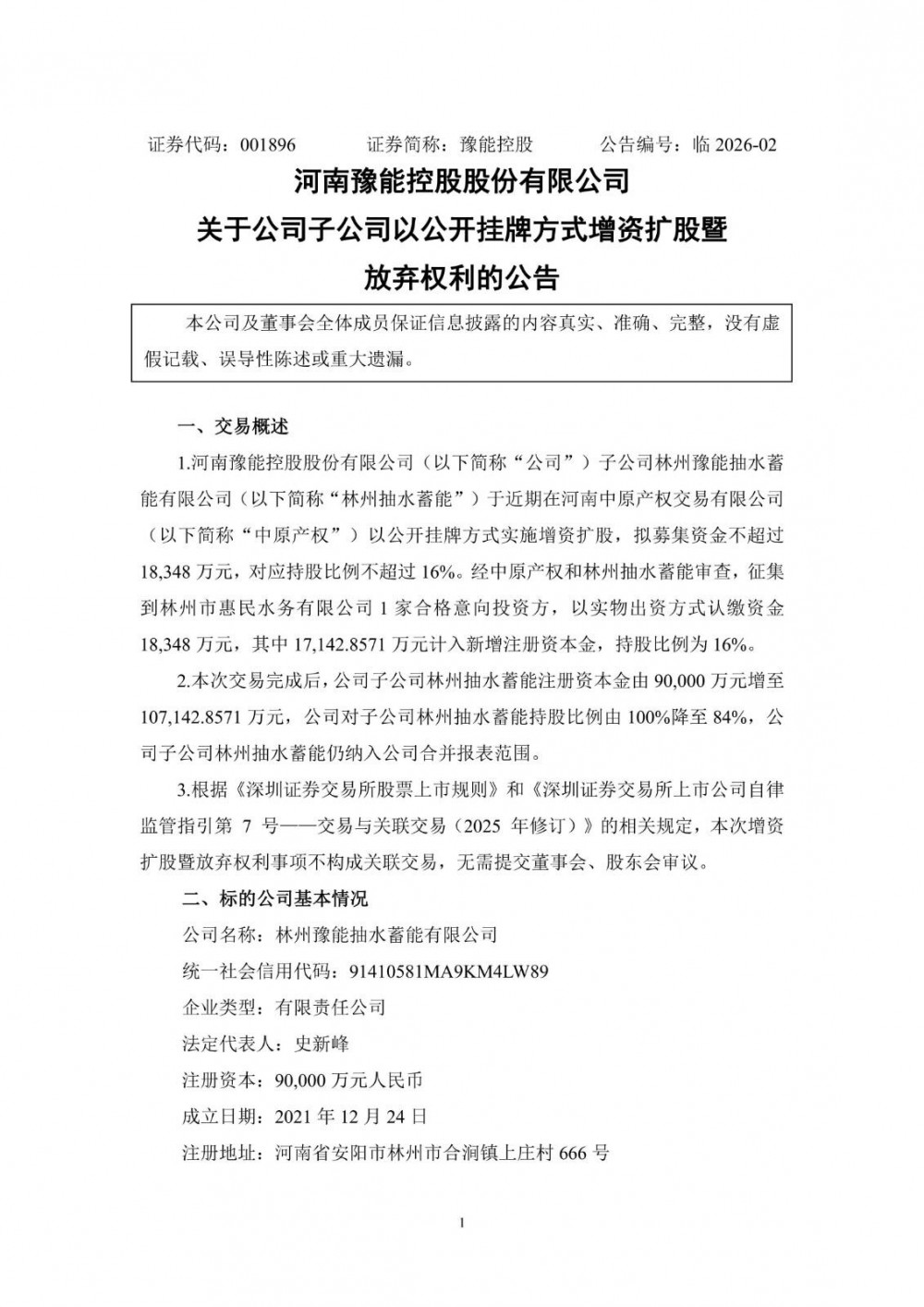 近日,豫能控股发布公告称,公司子公司林州豫能抽水蓄能有限公司于近期在河南中原产权交易有限公司以公开挂牌方式实施增资扩股,拟募集资金不超过18,348万元,对应持股比例不超过16%。经中原产权和林州抽水蓄能审查,征集到林州市惠民水务有限公司1家合格意向投资方,以实物出资方式认缴资金18,348万元,其中17,142.8571万元计入新增注册资本金,持股比例为16%。