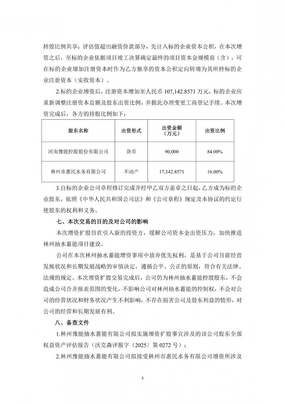 本次交易完成后,豫能控股子公司林州抽水蓄能注册资本金由90,000万元增至107,142.8571万元,公司对子公司林州抽水蓄能持股比例由100%降至84%,公司子公司林州抽水蓄能仍纳入公司合并报表范围。