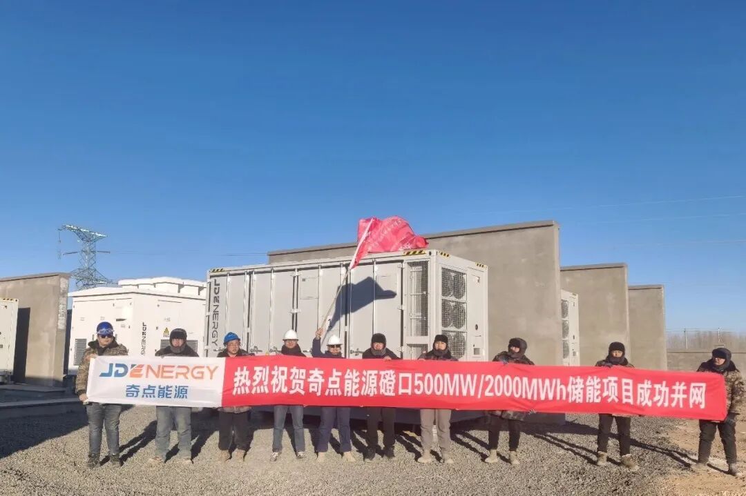 2025年12月,内蒙古磴口500MW/2000MWh储能项目成功并网。这座在冬日阳光下巍然矗立的储能电站,是奇点能源交付的首个GWh级项目,不仅成功刷新了单体项目规模的纪录,更以其卓越的建设成果,铸就了公司发展史上的重要里程碑。