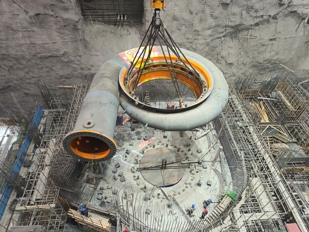2号机组蜗壳延伸段与座环蜗壳组焊整体吊装,工艺优化节省直线工期10天,显著提升了施工效率。为确保座环蜗壳安装精度符合设计要求,石台监理部充分发挥专业技术优势,组织提前策划,精准放样与定位复核,控制焊接质量,为后续机电安装奠定了坚实基础。