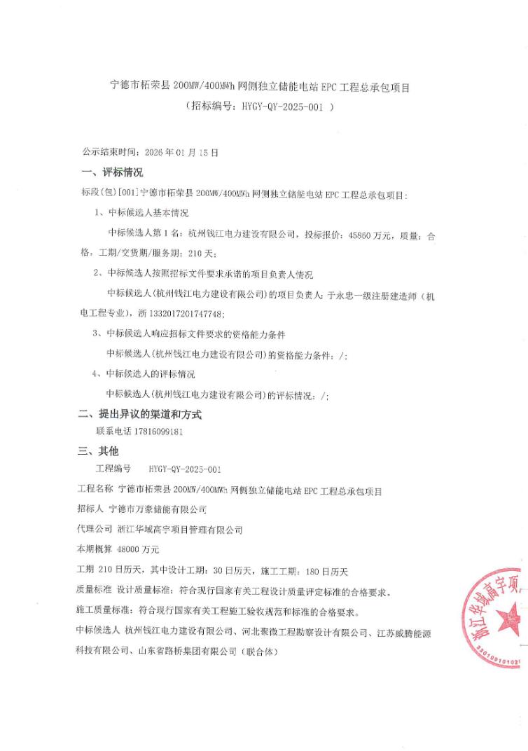 第一中标候选人为杭州钱江电力建设有限公司、河北聚微工程勘察设计有限公司、江苏威腾能源科技有限公司、山东省路桥集团有限公司联合体,投标报价为45860万元,折合单价1.1465元/Wh。