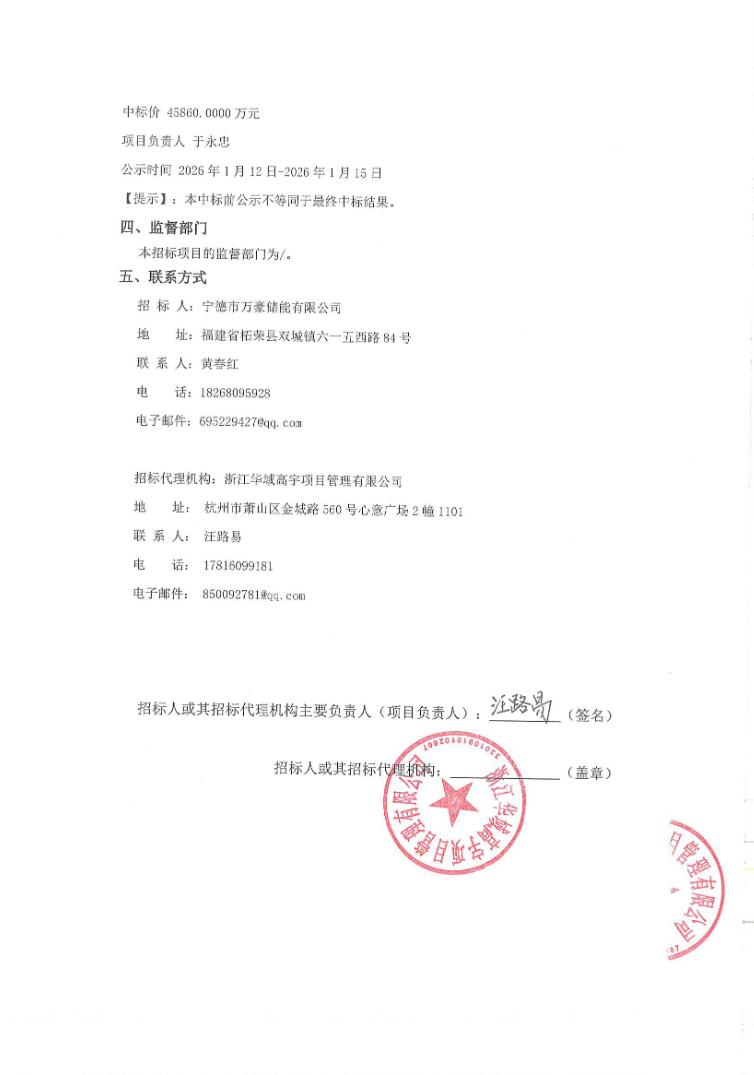 项目招标人为宁德市万豪储能有限公司,本项目投资估算50000万元,工程概算48000万元。