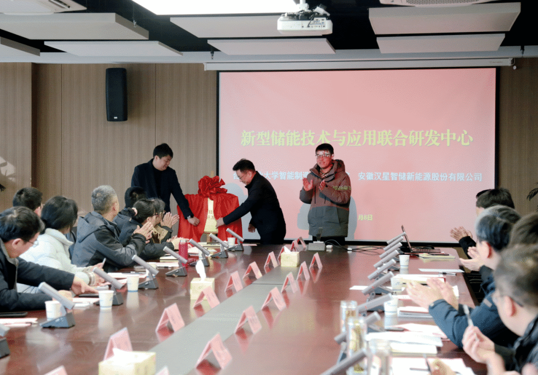 1月8日上午,安徽汉星智储新能源股份有限公司-合肥工业大学智能制造技术研究院“新型储能技术与应用联合研发中心”揭牌仪式在合工大智能院举行。合工大智能院院长杨学志、汉星智储总裁胡飞共同为联合研发中心揭牌。合工大智能院副院长朱晓勇主持仪式,双方代表共同见证这一重要时刻。