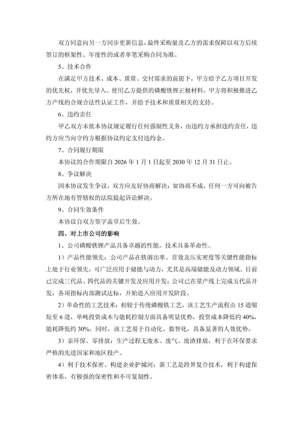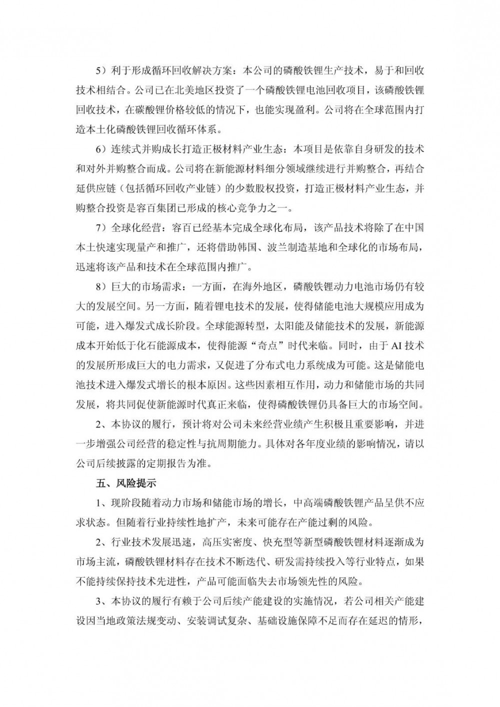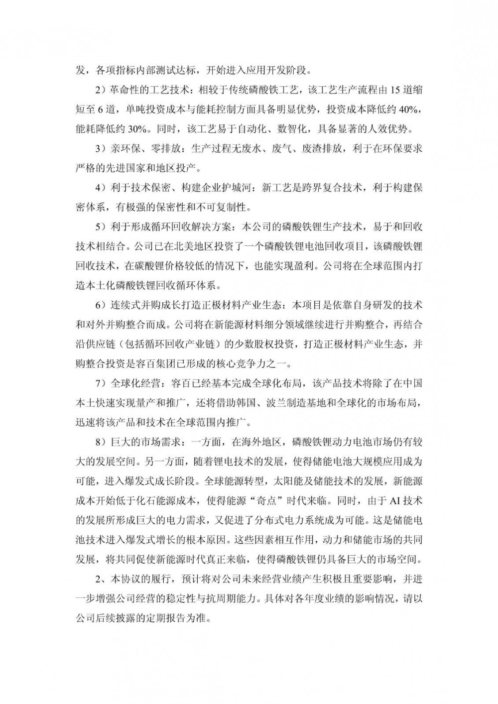 本协议对双方均具有约束性。一方面,在海外地区磷酸铁锂动力电池有很大的发展空间。另一方面,由于太阳能电池及储能电池技术的发展,成本不断降低,再加上AI技术的发展,以及这三项技术的相互作用,使得新能源时代真正来临,储能行业得到爆发式增长。动力和储能市场的发展,使得磷酸铁锂仍具备巨大的市场空间。