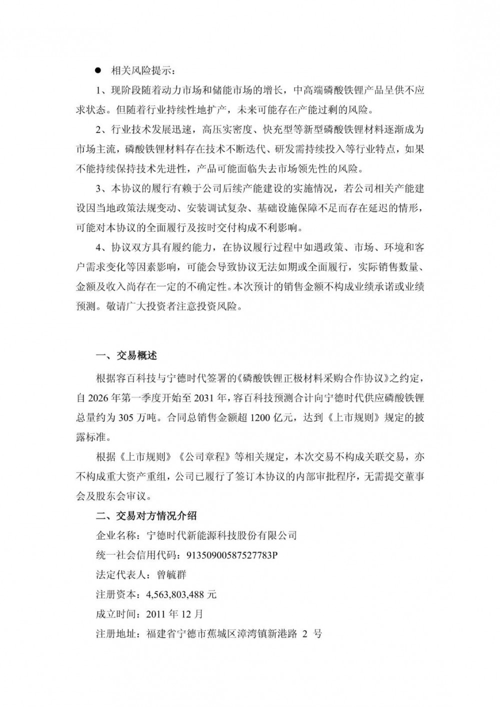 协议约定,自2026年第一季度开始至2031年,容百科技合计为宁德时代供应国内区域磷酸铁锂正极材料预计为305万吨,协议总销售金额超1200亿元。