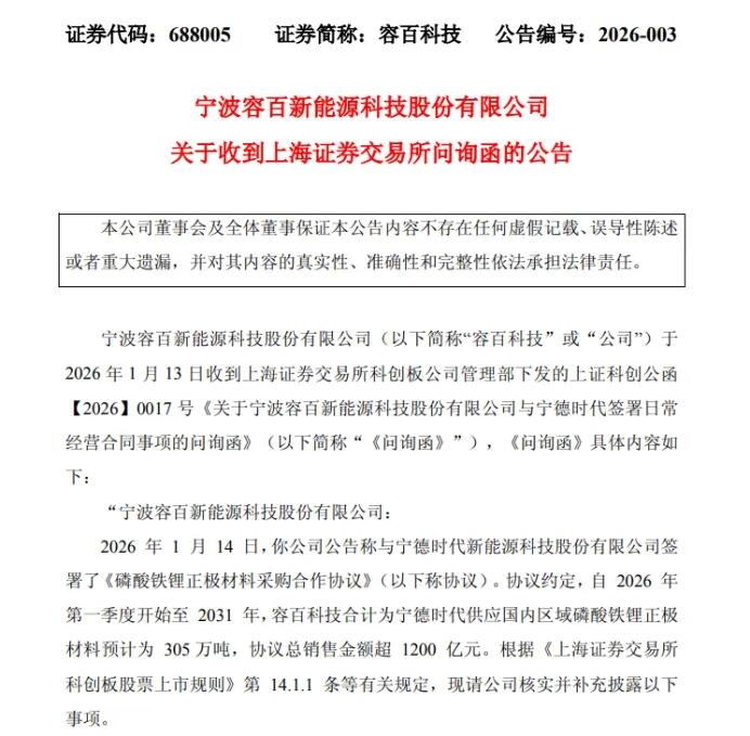 容百科技在披露千亿大单后,遭到交易所连夜问询,上交所要求公司核实并补充披露关于信息披露准确性、协议内容、内幕交易防控及其他事项。
