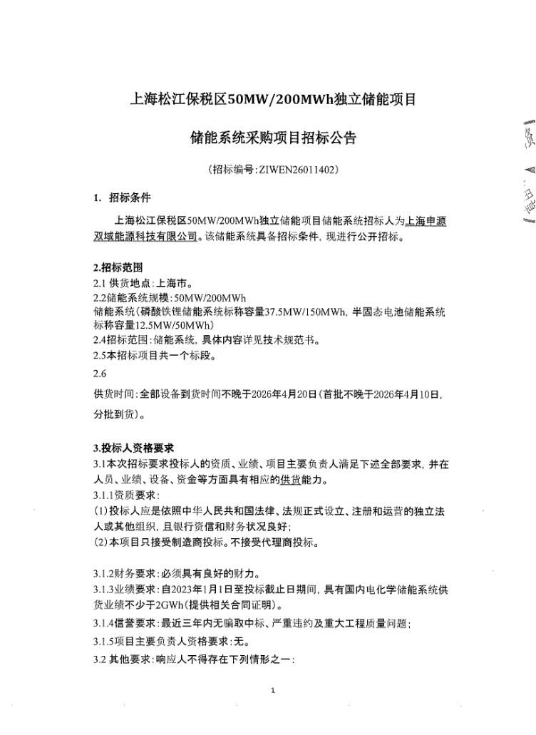 1月14日,上海松江保税区50MW/200MWh独立储能项目储能系统采购项目发布招标公告。