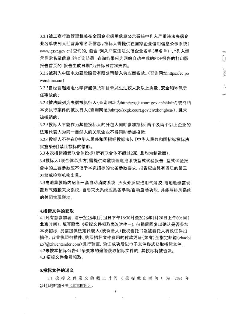 投标人需在2023年1月1日至投标截止日期间,具备国内电化学储能系统供货量不少于2GWh的业绩。项目允许不超过两家制造商组成的联合体投标。