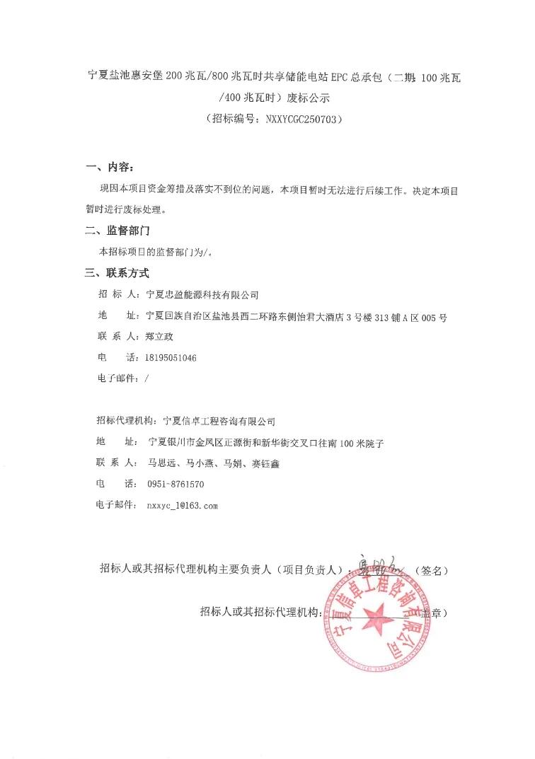 能源圈获悉,1月14日,宁夏盐池惠安堡200兆瓦/800兆瓦时共享储能电站EPC总承包一期、二期招标项目发布废标公告。