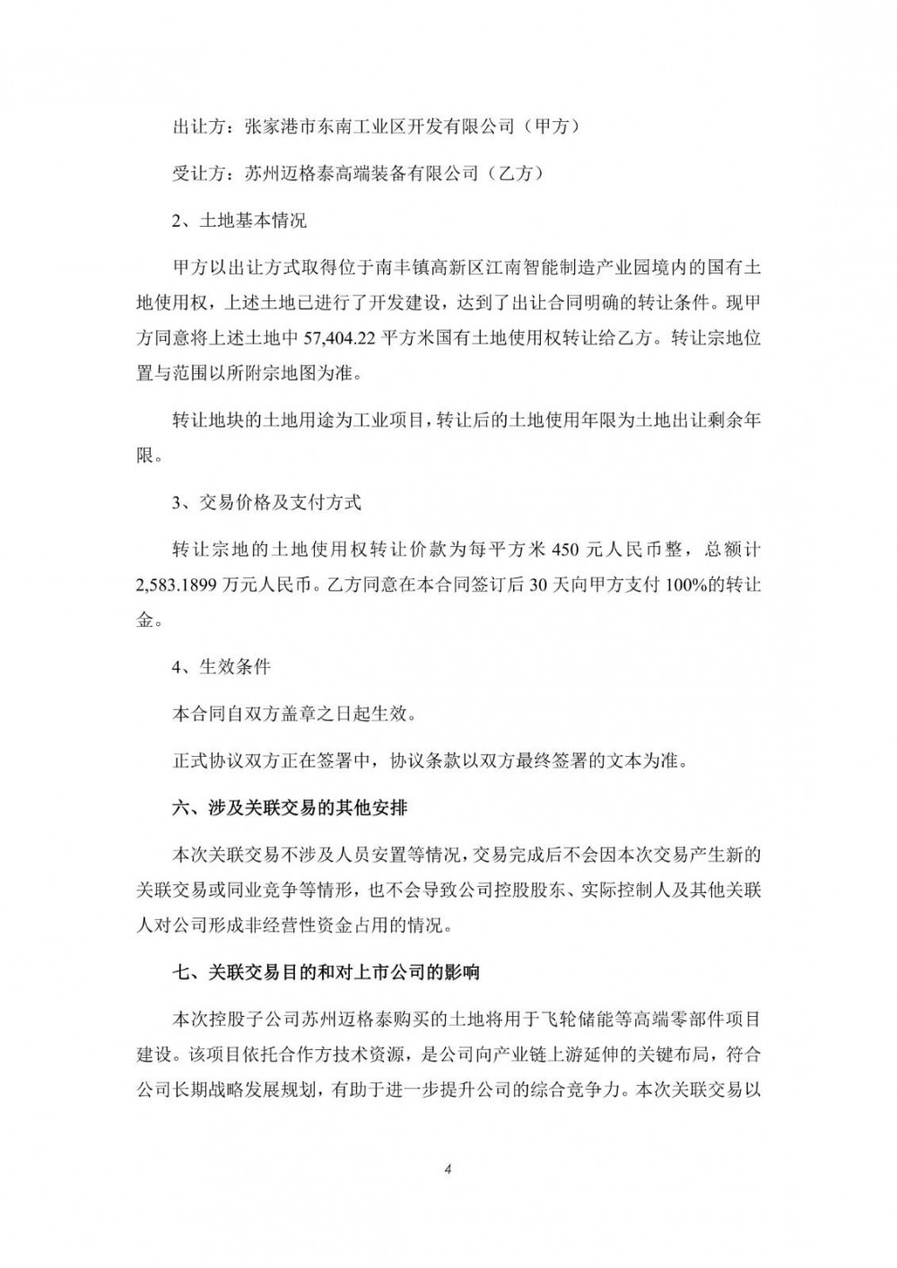 本次控股子公司苏州迈格泰购买的土地将用于飞轮储能等高端零部件项目建设。该项目依托合作方技术资源,是公司向产业链上游延伸的关键布局,符合公司长期战略发展规划,有助于进一步提升公司的综合竞争力。本次关联交易以评估价值为依据进行定价,关联交易风险可控,不存在损害公司和全体股东,特别是中小股东合法权益的情形。