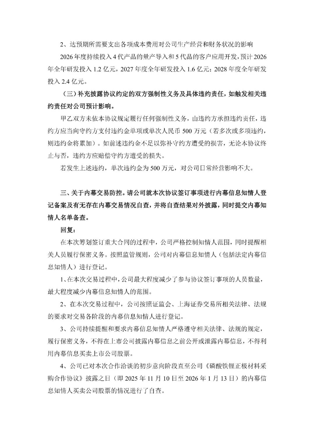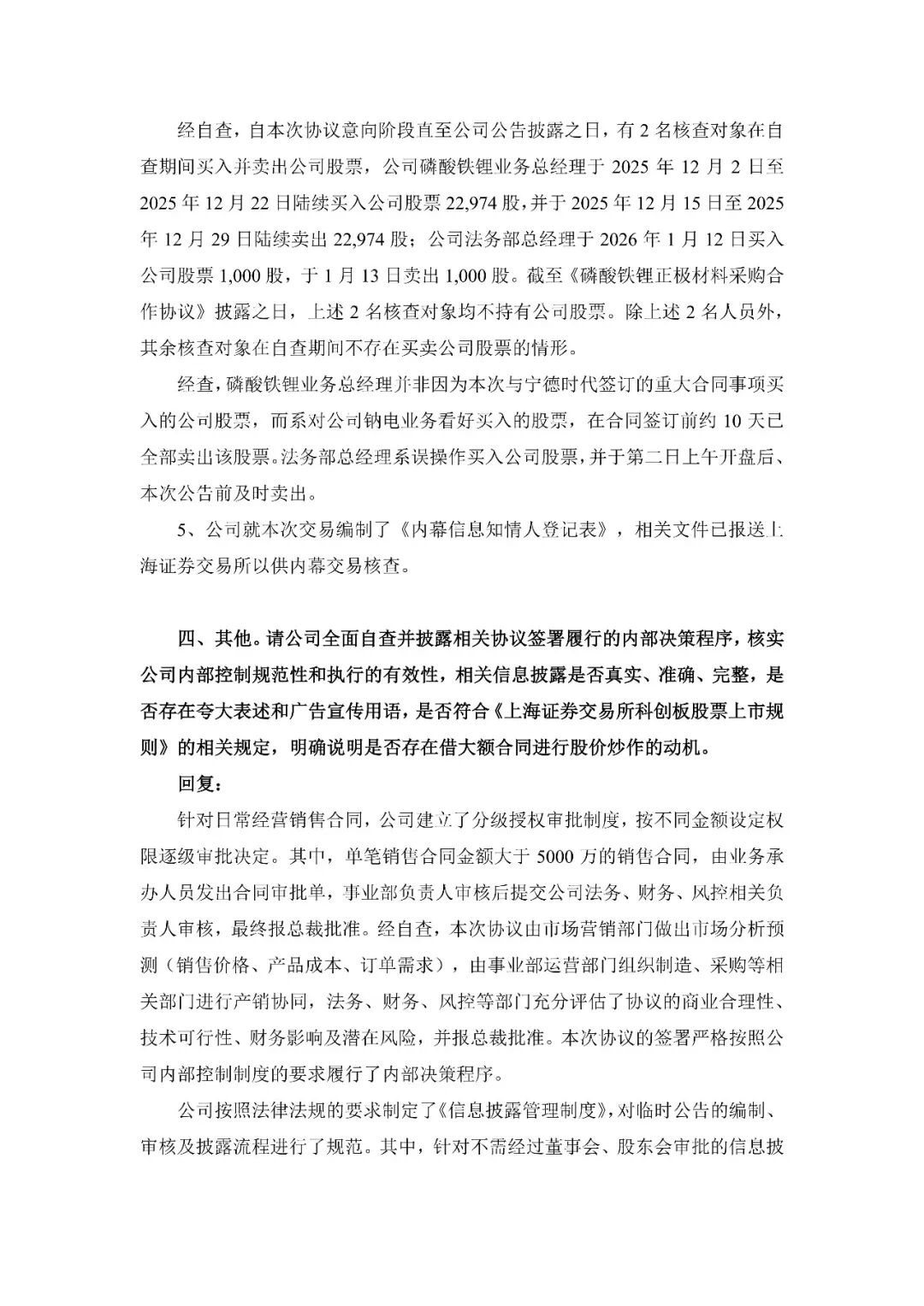 回复函还显示,容百科技已对本次合作洽谈的初步意向阶段直至公司《磷酸铁锂正极材料采购合作协议》披露之日(即2025年11月10日至2026年1月13日)的内幕信息知情人买卖公司股票的情况进行了自查。