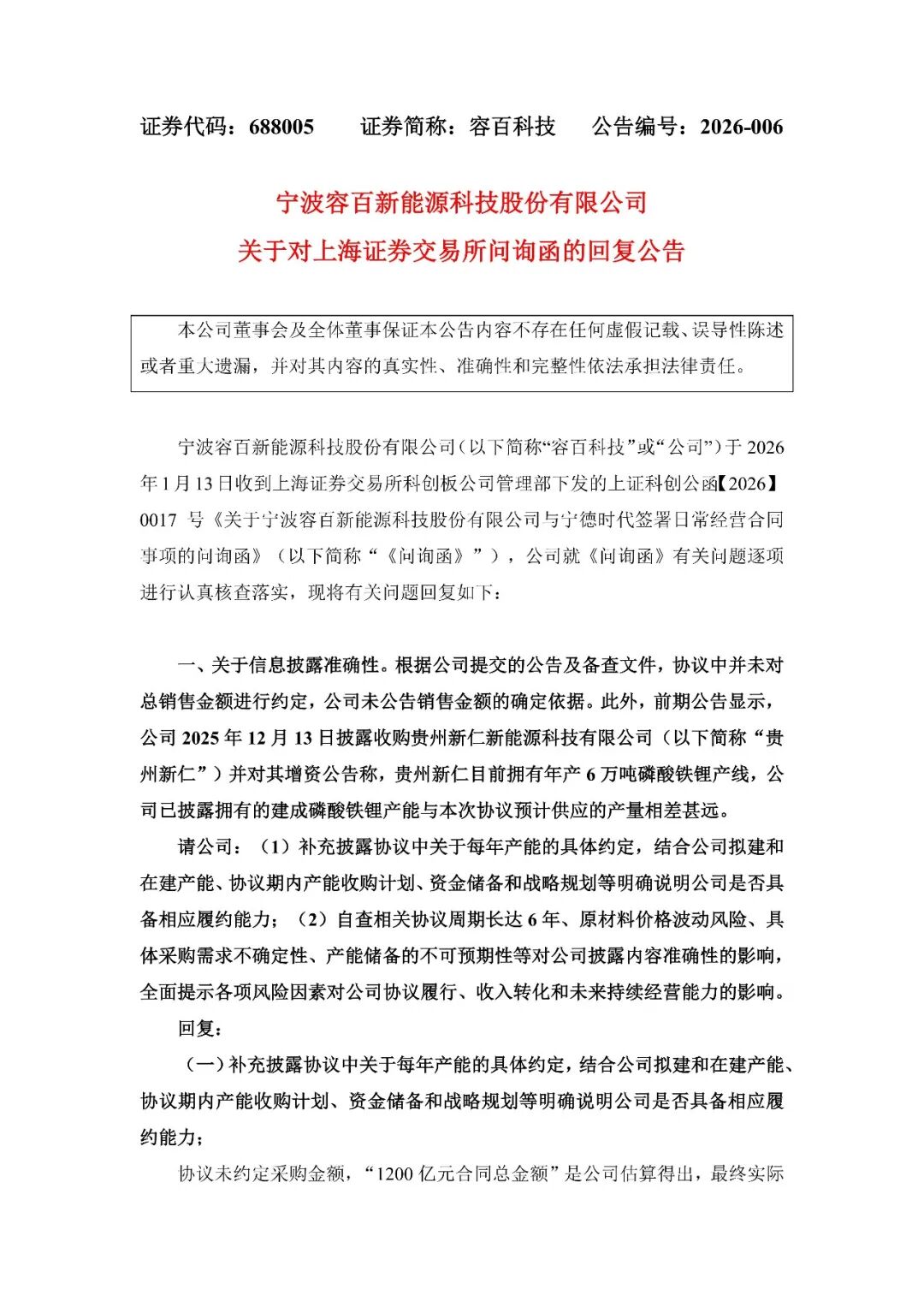 在回复函中,容百科技表示,协议未约定采购金额,“1200亿元合同总金额”是公司估算得出,最终实际销售规模需根据实际订单签订时的原材料价格以及数量确定,销售金额具有不确定性。