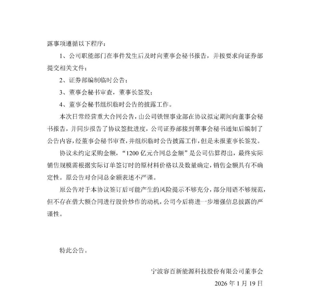公告称,2026年1月14日,宁波容百新能源科技股份有限公司(简称容百科技)披露日常经营重大合同的公告,涉嫌误导性陈述。近日,证监会已对容百科技立案调查。下一步,将在全面调查的基础上依法处理,切实维护市场健康稳定发展。