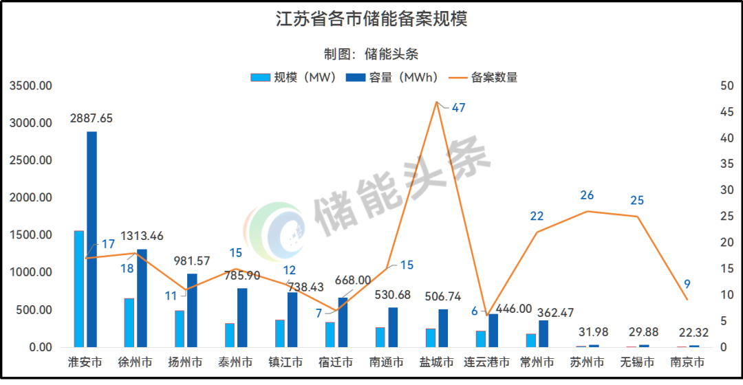 盐城市备案规模为253.605MW/506.743MWh,备案数量47个,为备案数量最多;