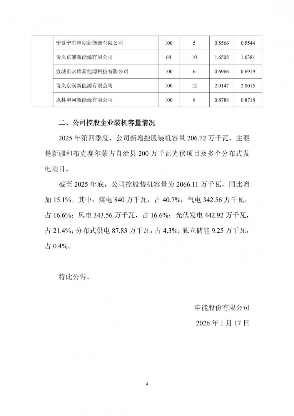 2025年第四季度,公司新增控股装机容量206.72万千瓦,主要是新疆和布克赛尔蒙古自治县200万千瓦光伏项目及多个分布式发电项目。