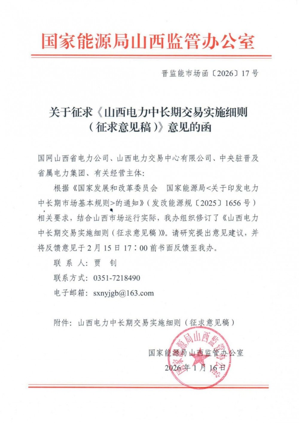 1月16日,国家能源局山西监管办公室发布关于征求《山西电力中长期交易实施细则(征求意见稿)》意见的函。