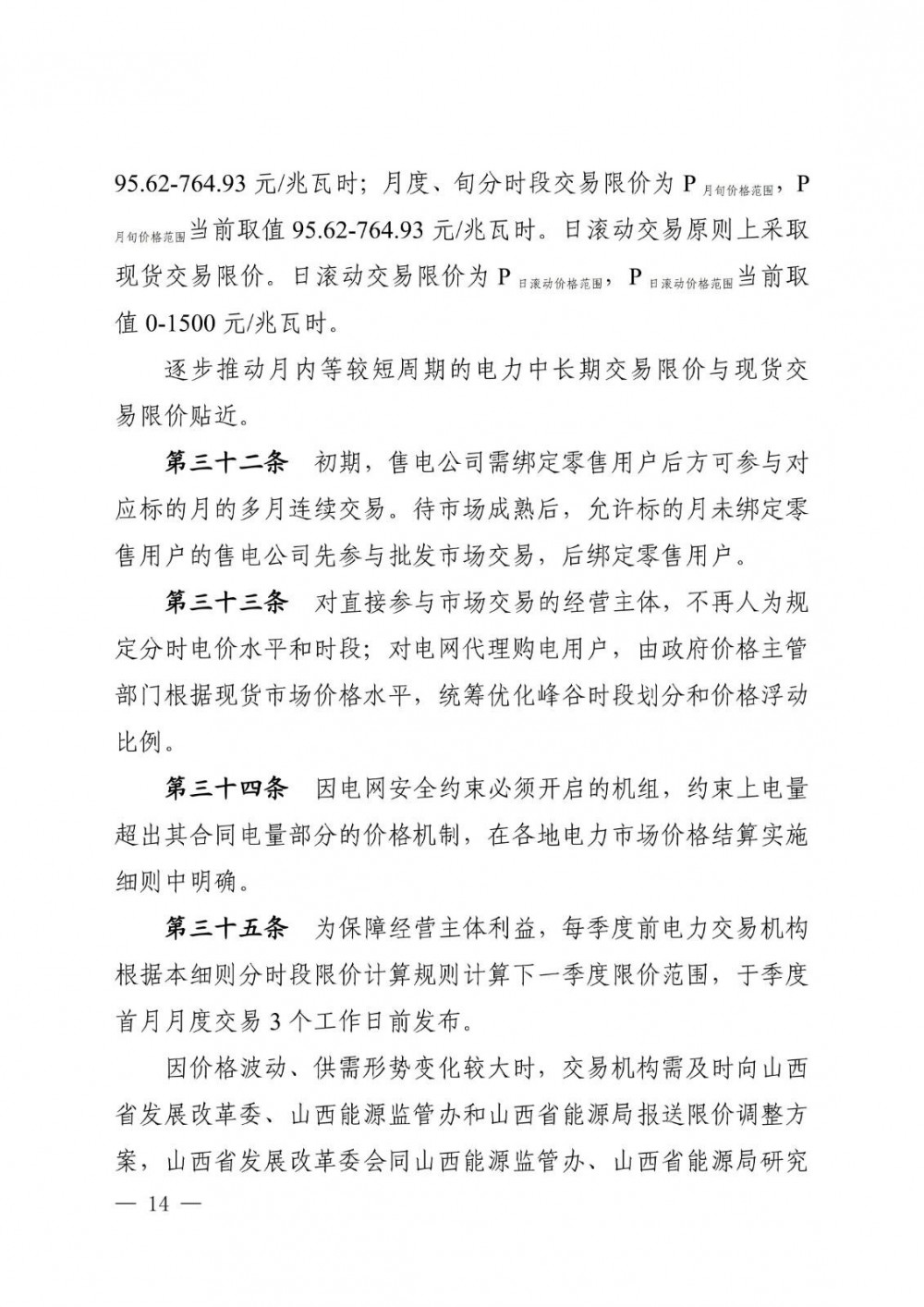 多月、月度、旬分时段交易最高、最低限价按分时基准价+上下浮动方式形成,分时基准价由山西省燃煤发电基准价乘以现货交易峰谷系数确定。其中平段基准价为332元/兆瓦时,最高限价原则上不高于燃煤发电基准价×(1+20%)×(1+该时段分时电价政策浮动比例)×(1+20%),下限原则上不低于燃煤发电基准价×(1-20%)×(1-该时段分时电价政策浮动比例)×(1-20%),根据《关于完善分时电价机制有关事项的通知》(晋发改商品发〔2021〕479号)测算确定,最高限价为764.93元/兆瓦时、最低限价为95.62元/兆瓦时。山西省工商业用户分时电价政策调整后,相应调整。多月连续交易限价为P多月价格范围,P多月价格范围当前取值95.62-764.93元/兆瓦时;月度、旬分时段交易限价为P月旬价格范围,P月旬价格范围当前取值95.62-764.93元/兆瓦时。日滚动交易原则上采取现货交易限价。日滚动交易限价为P日滚动价格范围,P日滚动价格范围当前取值0-1500元/兆瓦时。逐步推动月内等较短周期的电力中长期交易限价与现货交易限价贴近。