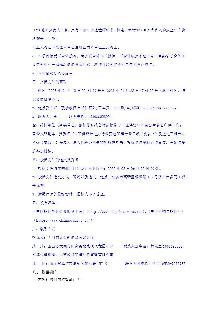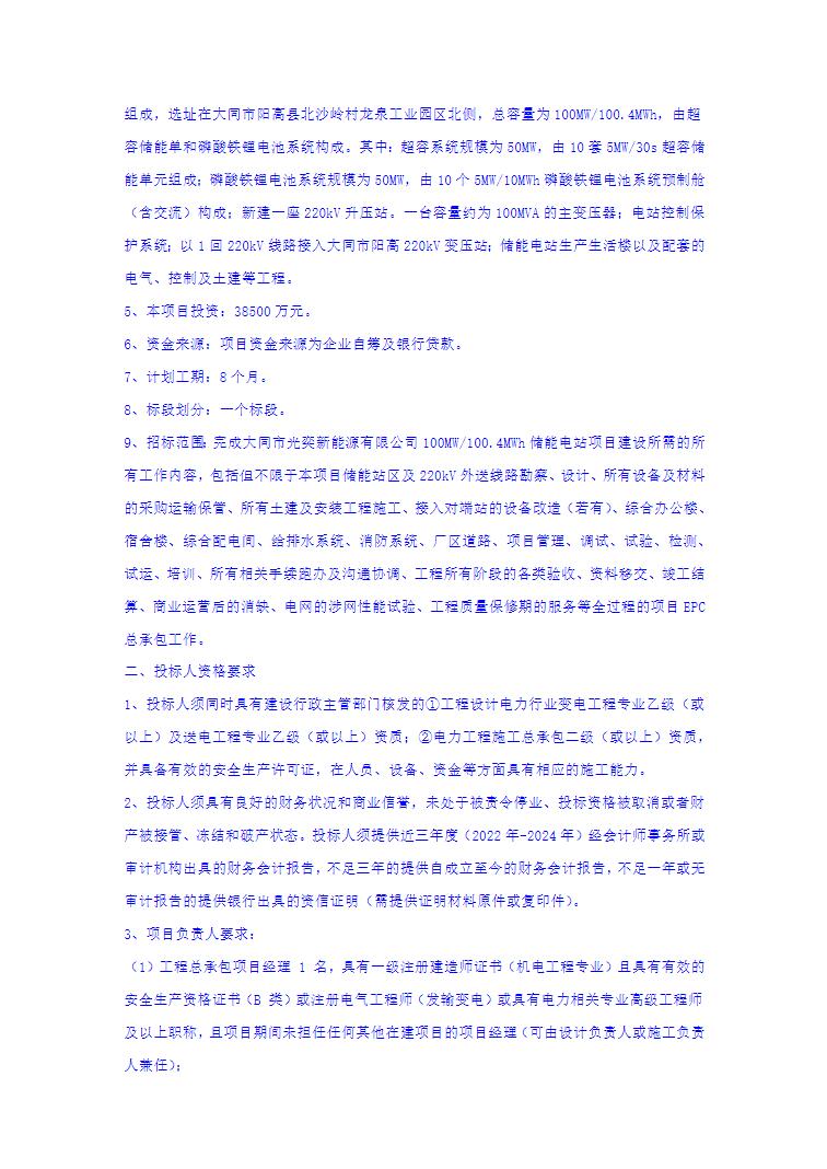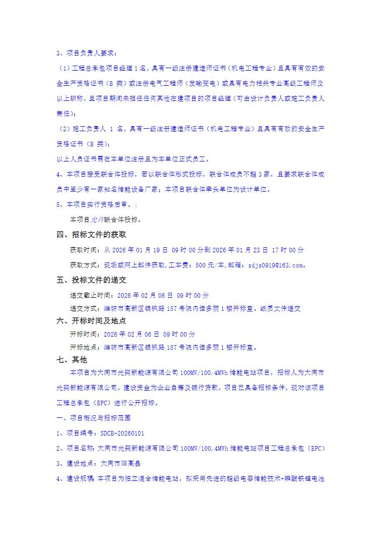 1月16日,大同市光奕新能源有限公司100MW/100.4MWh储能电站项目工程总承包(EPC)招标公告发布。