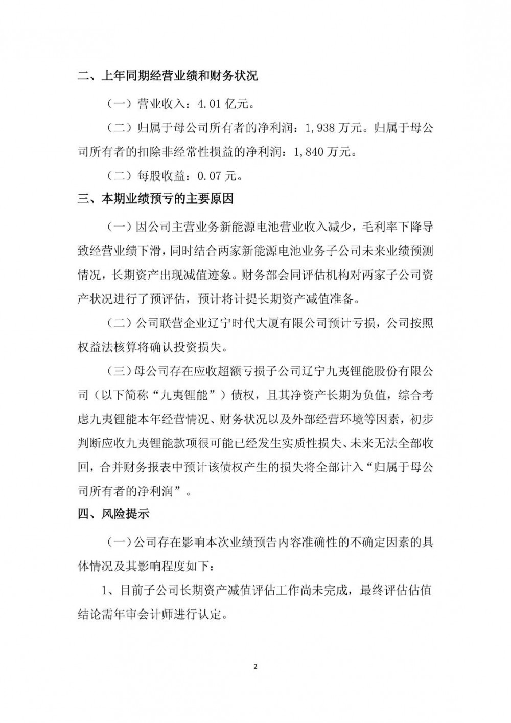时代万恒表示,因公司主营业务新能源电池营业收入减少,毛利率下降导致经营业绩下滑,同时结合两家新能源电池业务子公司未来业绩预测情况,长期资产出现减值迹象。财务部会同评估机构对两家子公司资产状况进行了预评估,预计将计提长期资产减值准备。