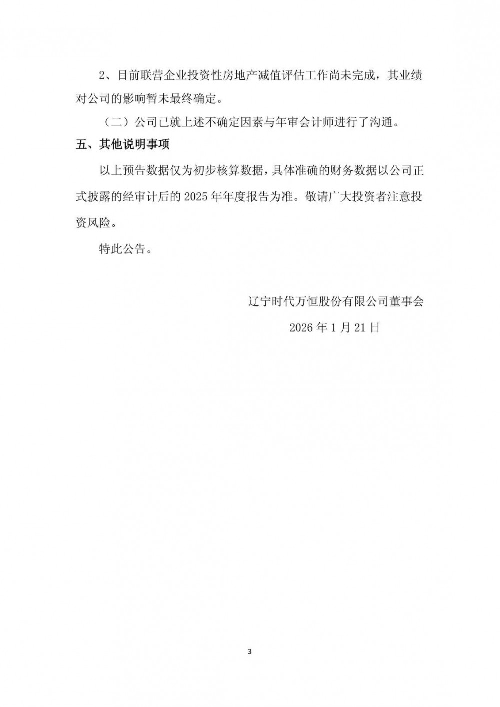 1月20日,时代万恒发布2025年年度业绩预亏公告。预计2025年年度实现营业收入3.83亿元左右、归属于母公司所有者的净利润为-1.40亿元到-1.20亿元,实现归属于母公司所有者的扣除非经常性损益后的净利润为-1.43亿元到-1.23亿元。