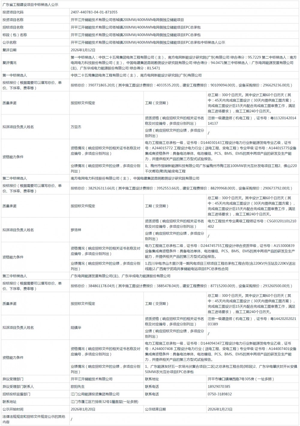 第一中标候选人为中铁二十五局集团电务工程有限公司、南方电网新能设计研究院(广东)有限公司联合体,投标总价为390771865.20元,折合单价0.977元/Wh;