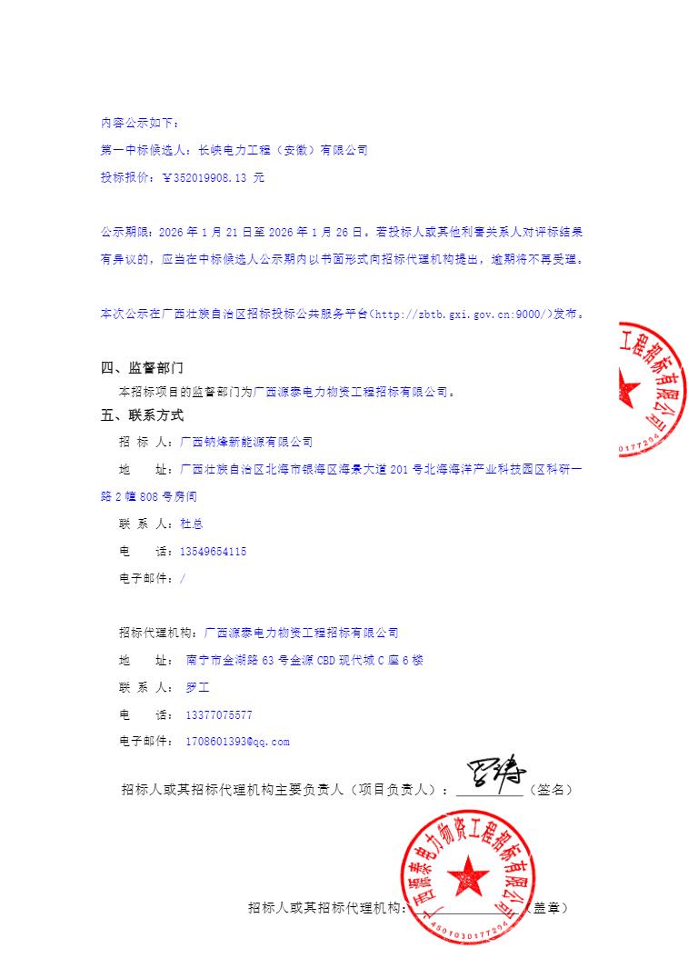 第一中标候选人为长峡电力工程(安徽)有限公司,投标报价为35201.990813万元,折合单价0.88元/Wh。