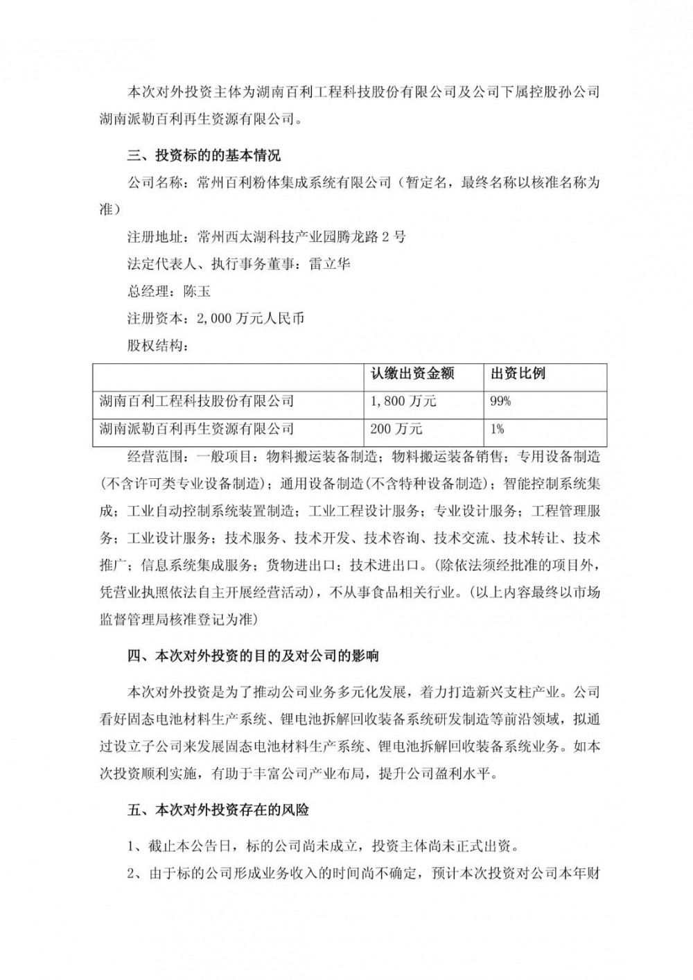 百利科技表示,本次对外投资是为了推动公司业务多元化发展,着力打造新兴支柱产业。公司看好固态电池材料生产系统、锂电池拆解回收装备系统研发制造等前沿领域,拟通过设立子公司来发展固态电池材料生产系统、锂电池拆解回收装备系统业务。如本次投资顺利实施,有助于丰富公司产业布局,提升公司盈利水平。
