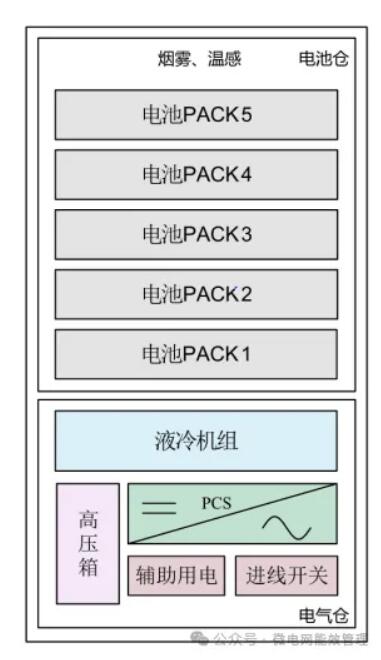 储能系统分为电池舱和电气舱,双舱分离设计。电池舱位于柜顶,装有5 组电池PACK。电气舱位于柜 底,装有液冷机组、储能变流器、高压箱、辅助用电和进线开关等。详细参照机柜系统布局图如图所示。
